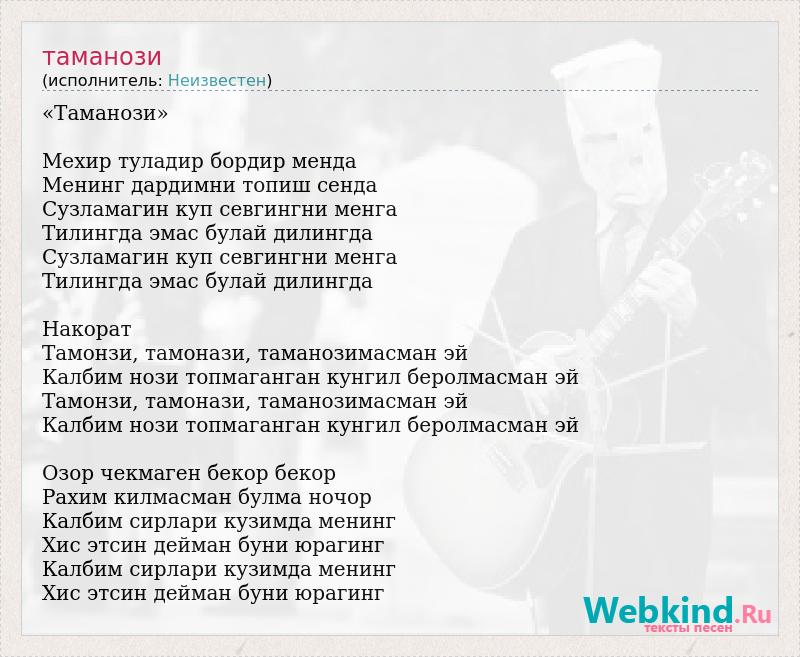 «Таманози» Мехир туладир бордир менда Менинг дардимни топиш сенда Сузламагин куп севгингни менга Тилингда эмас булай дилингда Сузламагин куп севгингни менга Тилингда эмас булай дилингда Накорат Тамонзи, тамонази, таманозимасман эй Калбим нози топмаганган кунгил беролмасман эй Тамонзи, тамонази, таманозимасман эй Калбим нози топмаганган кунгил беролмасман эй Озор чекмаген бекор бекор Рахим килмасман булма ночор Калбим сирлари кузимда менинг Хис этсин дейман буни юрагинг Калбим сирлари кузимда менинг Хис этсин дейман буни юрагинг