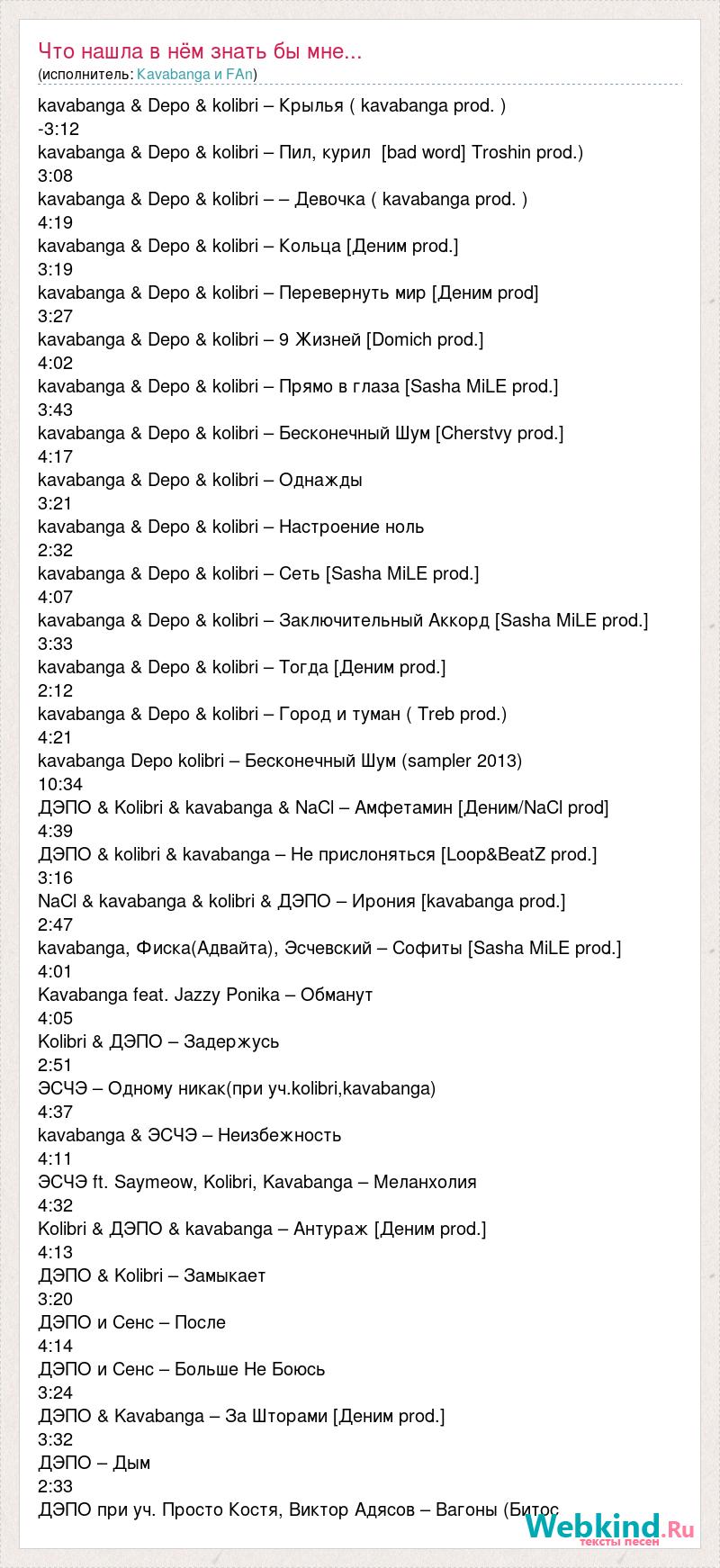 kavabanga & Depo & kolibri – Крылья ( kavabanga prod. ) -3:12 kavabanga & Depo & kolibri – Пил, курил [bad word] Troshin prod.) 3:08 kavabanga & Depo & kolibri – – Девочка ( kavabanga prod. ) 4:19 kavabanga & Depo & kolibri – Кольца [Деним prod.] 3:19 kavabanga & Depo & kolibri – Перевернуть мир [Деним prod] 3:27 kavabanga & Depo & kolibri – 9 Жизней [Domich prod.] 4:02 kavabanga & Depo & kolibri – Прямо в глаза [Sasha MiLE prod.] 3:43 kavabanga & Depo & kolibri – Бесконечный Шум [Cherstvy prod.] 4:17 kavabanga & Depo & kolibri – Однажды 3:21 kavabanga & Depo & kolibri – Настроение ноль 2:32 kavabanga & Depo & kolibri – Сеть [Sasha MiLE prod.] 4:07 kavabanga & Depo & kolibri – Заключительный Аккорд [Sasha MiLE prod.] 3:33 kavabanga & Depo & kolibri – Тогда [Деним prod.] 2:12 kavabanga & Depo & kolibri – Город и туман ( Treb prod.) 4:21 kavabanga Depo kolibri – Бесконечный Шум (sampler 2013) 10:34 ДЭПО & Kolibri & kavabanga & NaCl – Амфетамин [Деним/NaCl prod] 4:39 ДЭПО & kolibri & kavabanga – Не прислоняться [Loop&BeatZ prod.] 3:16 NaCl & kavabanga & kolibri & ДЭПО – Ирония [kavabanga prod.] 2:47 kavabanga, Фиска(Адвайта), Эсчевский – Софиты [Sasha MiLE prod.] 4:01 Kavabanga feat. Jazzy Ponika – Обманут 4:05 Kolibri & ДЭПО – Задержусь 2:51 ЭСЧЭ – Одному никак(при уч.kolibri,kavabanga) 4:37 kavabanga & ЭСЧЭ – Неизбежность 4:11 ЭСЧЭ ft. Saymeow, Kolibri, Kavabanga – Меланхолия 4:32 Kolibri & ДЭПО & kavabanga – Антураж [Деним prod.] 4:13 ДЭПО & Kolibri – Замыкает 3:20 ДЭПО и Сенс – После 4:14 ДЭПО и Сенс – Больше Не Боюсь 3:24 ДЭПО & Kavabanga – За Шторами [Деним prod.] 3:32 ДЭПО – Дым 2:33 ДЭПО при уч. Просто Костя, Виктор Адясов – Вагоны (Битос