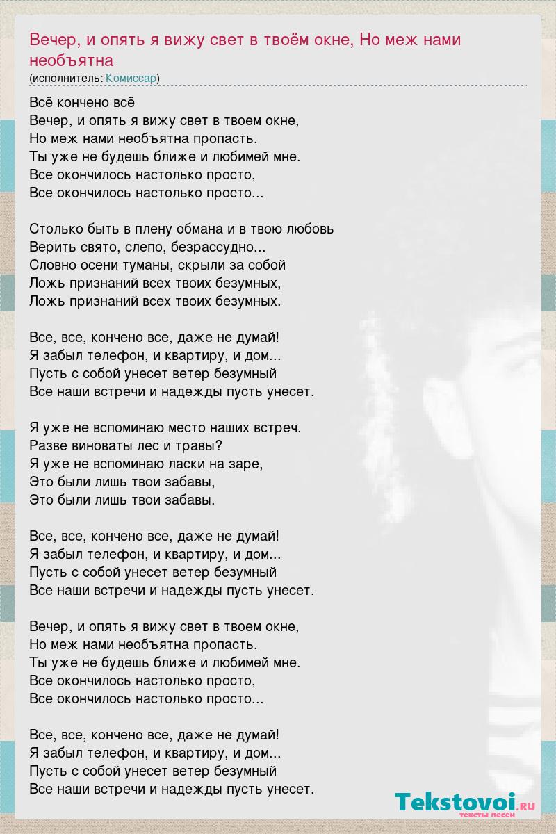 Всё кончено всё Вечер, и опять я вижу свет в твоем окне, Но меж нами необъятна пропасть. Ты уже не будешь ближе и любимей мне. Все окончилось настолько просто, Все окончилось настолько просто... Столько быть в плену обмана и в твою любовь Верить свято, слепо, безрассудно... Словно осени туманы, скрыли за собой Ложь признаний всех твоих безумных, Ложь признаний всех твоих безумных. Все, все, кончено все, даже не думай! Я забыл телефон, и квартиру, и дом... Пусть с собой унесет ветер безумный Все наши встречи и надежды пусть унесет. Я уже не вспоминаю место наших встреч. Разве виноваты лес и травы? Я уже не вспоминаю ласки на заре, Это были лишь твои забавы, Это были лишь твои забавы. Все, все, кончено все, даже не думай! Я забыл телефон, и квартиру, и дом... Пусть с собой унесет ветер безумный Все наши встречи и надежды пусть унесет. Вечер, и опять я вижу свет в твоем окне, Но меж нами необъятна пропасть. Ты уже не будешь ближе и любимей мне. Все окончилось настолько просто, Все окончилось настолько просто... Все, все, кончено все, даже не думай! Я забыл телефон, и квартиру, и дом... Пусть с собой унесет ветер безумный Все наши встречи и надежды пусть унесет.
