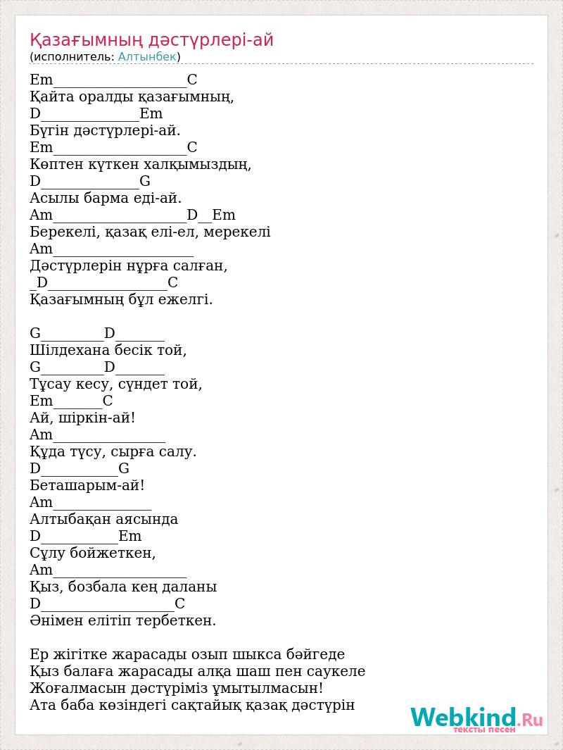 Em___________________C Қайта оралды қазағымның, D______________Em Бүгін дәстүрлері-ай. Em___________________C Көптен күткен халқымыздың, D______________G Асылы барма еді-ай. Am___________________D__Em Берекелі, қазақ елі-ел, мерекелі Am____________________ Дәстүрлерін нұрға салған, _D_________________C Қазағымның бұл ежелгі. G_________D_______ Шілдехана бесік той, G_________D_______ Тұсау кесу, сүндет той, Em_______C Ай, шіркін-ай! Am________________ Құда түсу, сырға салу. D___________G Беташарым-ай! Am______________ Алтыбақан аясында D___________Em Сұлу бойжеткен, Am___________________ Қыз, бозбала кең даланы D___________________C Әнімен елітіп тербеткен. Ер жігітке жарасады озып шыкса бәйгеде Қыз балаға жарасады алқа шаш пен саукеле Жоғалмасын дәстүріміз ұмытылмасын! Ата баба көзіндегі сақтайық қазақ дәстүрін