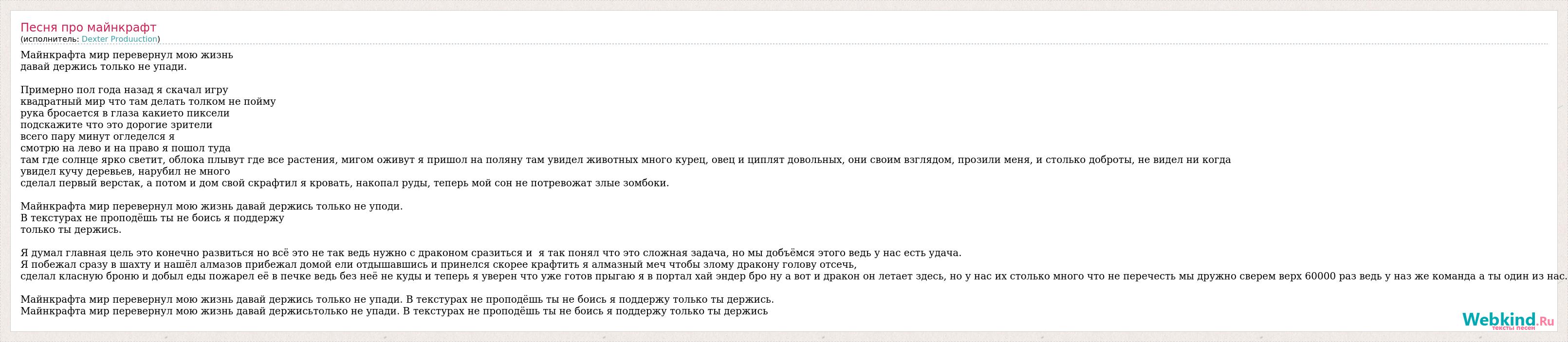 Майнкрафта мир перевернул мою жизнь давай держись только не упади. Примерно пол года назад я скачал игру квадратный мир что там делать толком не пойму рука бросается в глаза какието пиксели подскажите что это дорогие зрители всего пару минут огледелся я смотрю на лево и на право я пошол туда там где солнце ярко светит, облока плывут где все растения, мигом оживут я пришол на поляну там увидел животных много курец, овец и циплят довольных, они своим взглядом, прозили меня, и столько доброты, не видел ни когда увидел кучу деревьев, нарубил не много сделал первый верстак, а потом и дом свой скрафтил я кровать, накопал руды, теперь мой сон не потревожат злые зомбоки. Майнкрафта мир перевернул мою жизнь давай держись только не уподи. В текстурах не проподёшь ты не боись я поддержу только ты держись. Я думал главная цель это конечно развиться но всё это не так ведь нужно с драконом сразиться и я так понял что это сложная задача, но мы добъёмся этого ведь у нас есть удача. Я побежал сразу в шахту и нашёл алмазов прибежал домой ели отдышавшись и принелся скорее крафтить я алмазный меч чтобы злому дракону голову отсечь, сделал класную броню и добыл еды пожарел её в печке ведь без неё не куды и теперь я уверен что уже готов прыгаю я в портал хай эндер бро ну а вот и дракон он летает здесь, но у нас их столько много что не перечесть мы дружно сверем верх 60000 раз ведь у наз же команда а ты один из нас. Майнкрафта мир перевернул мою жизнь давай держись только не упади. В текстурах не проподёшь ты не боись я поддержу только ты держись. Майнкрафта мир перевернул мою жизнь давай держисьтолько не упади. В текстурах не проподёшь ты не боись я поддержу только ты держись