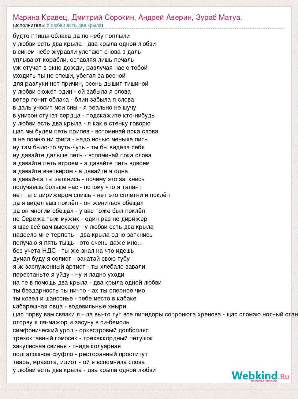 будто птицы-облака да по небу поплыли у любви есть два крыла - два крыла одной любви в синем небе журавли улетают снова в даль уплывают корабли, оставляя лишь печаль уж стучат в окно дожди, разлучая нас с тобой уходить ты не спеши, убегая за весной для разлуки нет причин, осень дышит тишиной у любви сюжет один - ой забыла я слова ветер гонит облака - блин забыла я слова в даль уносит мои сны - я реально не шучу в унисон стучат сердца - подскажите кто-нибудь у любви есть два крыла - я как в стенку говорю щас мы будем петь припев - вспоминай пока слова я не помню ни фига - надо ночью меньше пить ну там было-то чуть-чуть - ты бы видела себя ну давайте дальше петь - вспоминай пока слова а давайте петь втроем - а давайте петь вдвоем а давайте вчетвером - а давайте я одна а давай-ка ты заткнись - почему это заткнись получаешь больше нас - потому что я талант нет ты с дирижером спишь - нет это сплетни и поклёп да я видел ваш поклёп - он жениться обещал да он многим обещал - у вас тоже был поклёп но Сережа тыж мужик - один раз не дирижер я щас всё вам выскажу - у любви есть два крыла надоело мне терпеть - два крыла одно заткнись получаю я пять тыщь - это очень даже мно... без учета НДС - ты же знал на что идешь думал буду я солист - закатай свою губу я ж заслуженный артист - ты хлебало завали перестаньте я уйду - ну и ладно уходи на те в помощь два крыла - два крыла одной любви ты бездарность ты ничто - ах ты оперное чмо ты козел и шансонье - тебе место в кабаке кабарешная овца - водевильные хмыри щас порву вам связки я - да вы-то тут все пипидоры сопронюга хренова - щас сломаю нотный стан оторву я ля-мажор и засуну в си-бемоль симфонический урод - оркестровый долбопляс трехоктавный гомосек - трехаккордный петушок закулисная свинья - гнида колуарная подгалошное фуфло - ресторанный проститут тварь, мразота, идиот - ой я вспомнила слова у любви есть два крыла - два крыла одной любви