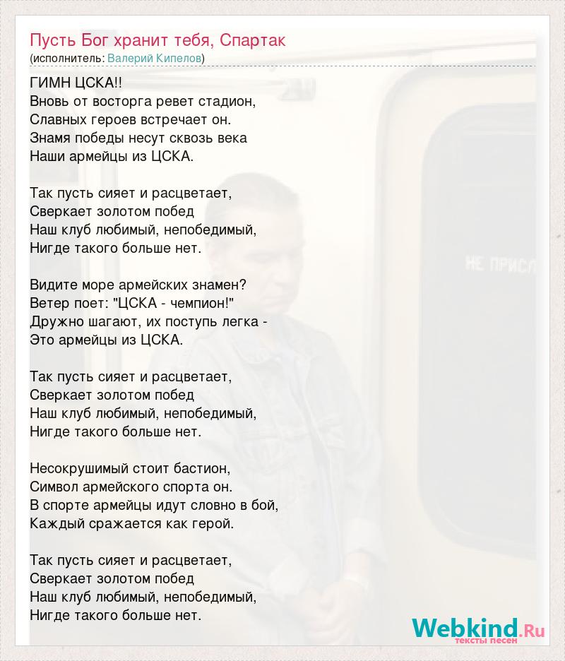 ГИМН ЦСКА!! Вновь от восторга ревет стадион, Славных героев встречает он. Знамя победы несут сквозь века Наши армейцы из ЦСКА. Так пусть сияет и расцветает, Сверкает золотом побед Наш клуб любимый, непобедимый, Нигде такого больше нет. Видите море армейских знамен? Ветер поет: "ЦСКА - чемпион!" Дружно шагают, их поступь легка - Это армейцы из ЦСКА. Так пусть сияет и расцветает, Сверкает золотом побед Наш клуб любимый, непобедимый, Нигде такого больше нет. Несокрушимый стоит бастион, Символ армейского спорта он. В спорте армейцы идут словно в бой, Каждый сражается как герой. Так пусть сияет и расцветает, Сверкает золотом побед Наш клуб любимый, непобедимый, Нигде такого больше нет.