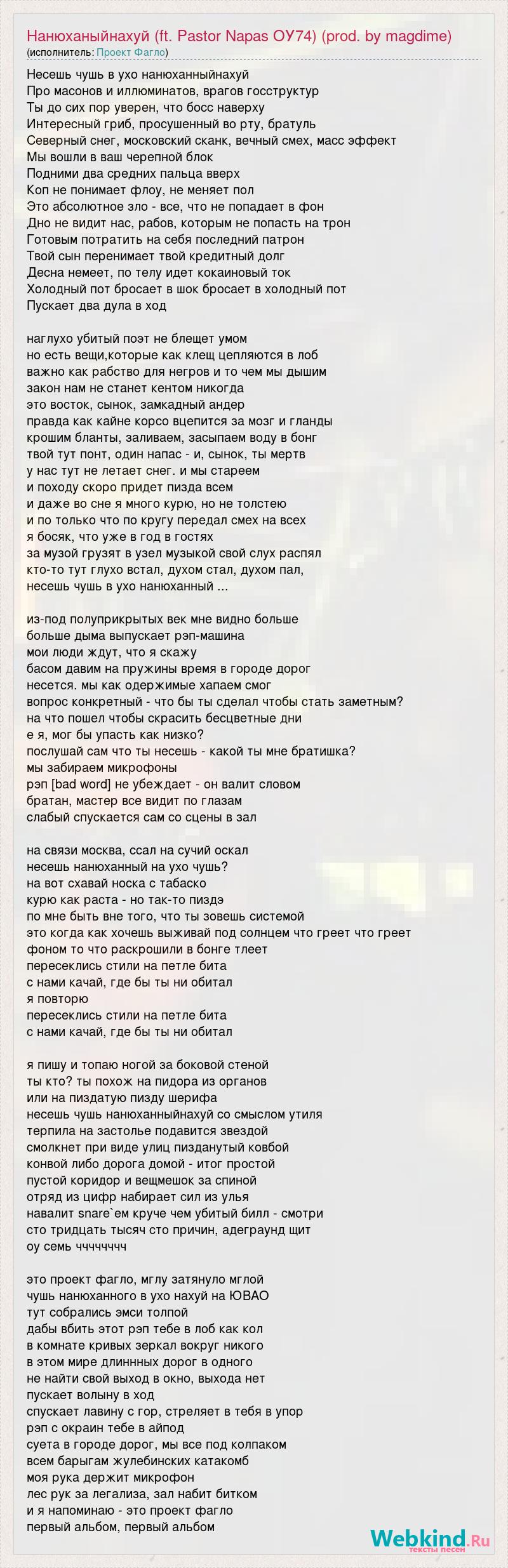 Несешь чушь в ухо нанюханныйнахуй Про масонов и иллюминатов, врагов госструктур Ты до сих пор уверен, что босс наверху Интересный гриб, просушенный во рту, братуль Северный снег, московский сканк, вечный смех, масс эффект Мы вошли в ваш черепной блок Подними два средних пальца вверх Коп не понимает флоу, не меняет пол Это абсолютное зло - все, что не попадает в фон Дно не видит нас, рабов, которым не попасть на трон Готовым потратить на себя последний патрон Твой сын перенимает твой кредитный долг Десна немеет, по телу идет кокаиновый ток Холодный пот бросает в шок бросает в холодный пот Пускает два дула в ход наглухо убитый поэт не блещет умом но есть вещи,которые как клещ цепляются в лоб важно как рабство для негров и то чем мы дышим закон нам не станет кентом никогда это восток, сынок, замкадный андер правда как кайне корсо вцепится за мозг и гланды крошим бланты, заливаем, засыпаем воду в бонг твой тут понт, один напас - и, сынок, ты мертв у нас тут не летает снег. и мы стареем и походу скоро придет пизда всем и даже во сне я много курю, но не толстею и по только что по кругу передал смех на всех я босяк, что уже в год в гостях за музой грузят в узел музыкой свой слух распял кто-то тут глухо встал, духом стал, духом пал, несешь чушь в ухо нанюханный ... из-под полуприкрытых век мне видно больше больше дыма выпускает рэп-машина мои люди ждут, что я скажу басом давим на пружины время в городе дорог несется. мы как одержимые хапаем смог вопрос конкретный - что бы ты сделал чтобы стать заметным? на что пошел чтобы скрасить бесцветные дни е я, мог бы упасть как низко? послушай сам что ты несешь - какой ты мне братишка? мы забираем микрофоны рэп [bad word] не убеждает - он валит словом братан, мастер все видит по глазам слабый спускается сам со сцены в зал на связи москва, ссал на сучий оскал несешь нанюханный на ухо чушь? на вот схавай носка с табаско курю как раста - но так-то пиздэ по мне быть вне того, что ты зовешь системой это когда как хочешь выживай под солнцем что греет что греет фоном то что раскрошили в бонге тлеет пересеклись стили на петле бита с нами качай, где бы ты ни обитал я повторю пересеклись стили на петле бита с нами качай, где бы ты ни обитал я пишу и топаю ногой за боковой стеной ты кто? ты похож на пидора из органов или на пиздатую пизду шерифа несешь чушь нанюханныйнахуй со смыслом утиля терпила на застолье подавится звездой смолкнет при виде улиц пизданутый ковбой конвой либо дорога домой - итог простой пустой коридор и вещмешок за спиной отряд из цифр набирает сил из улья навалит snare`ем круче чем убитый билл - смотри сто тридцать тысяч сто причин, адеграунд щит оу семь чччччччч это проект фагло, мглу затянуло мглой чушь нанюханного в ухо нахуй на ЮВАО тут собрались эмси толпой дабы вбить этот рэп тебе в лоб как кол в комнате кривых зеркал вокруг никого в этом мире длиннных дорог в одного не найти свой выход в окно, выхода нет пускает волыну в ход спускает лавину с гор, стреляет в тебя в упор рэп с окраин тебе в айпод суета в городе дорог, мы все под колпаком всем барыгам жулебинских катакомб моя рука держит микрофон лес рук за легализа, зал набит битком и я напоминаю - это проект фагло первый альбом, первый альбом