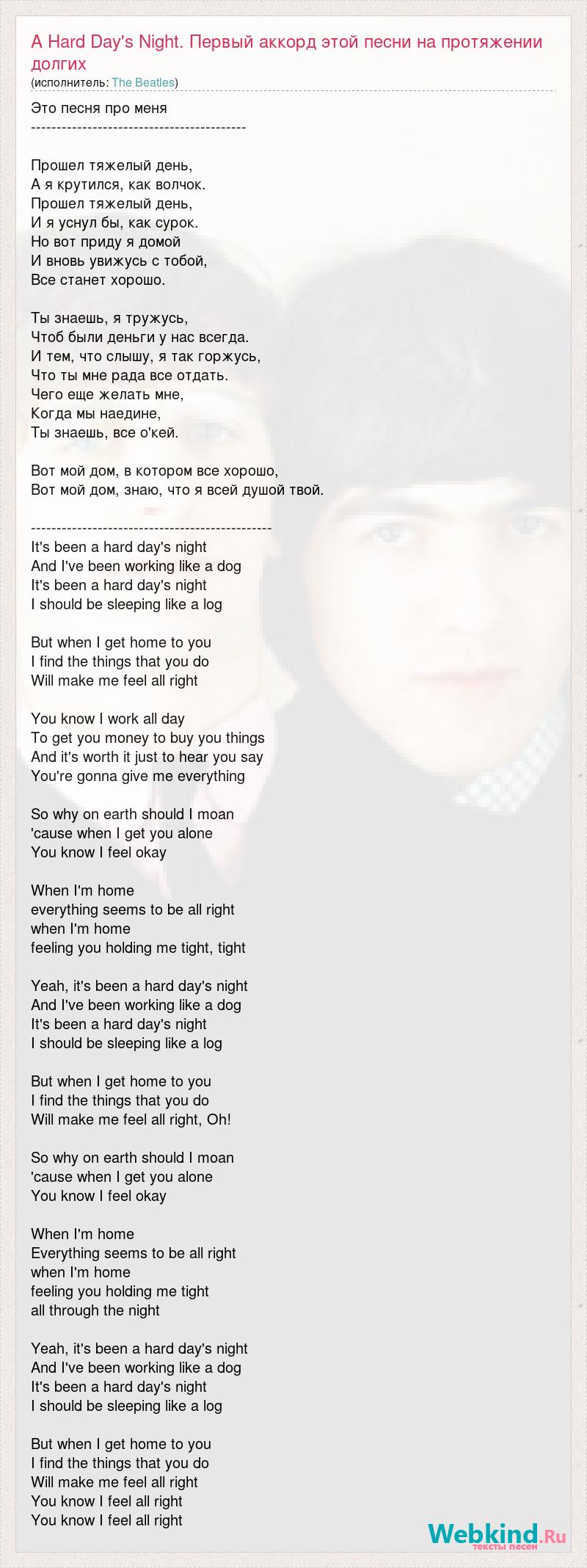 Это песня про меня ------------------------------------------ Прошел тяжелый день, А я крутился, как волчок. Прошел тяжелый день, И я уснул бы, как сурок. Но вот приду я домой И вновь увижусь с тобой, Все станет хорошо. Ты знаешь, я тружусь, Чтоб были деньги у нас всегда. И тем, что слышу, я так горжусь, Что ты мне рада все отдать. Чего еще желать мне, Когда мы наедине, Ты знаешь, все о'кей. Вот мой дом, в котором все хорошо, Вот мой дом, знаю, что я всей душой твой. ----------------------------------------------- It's been a hard day's night And I've been working like a dog It's been a hard day's night I should be sleeping like a log But when I get home to you I find the things that you do Will make me feel all right You know I work all day To get you money to buy you things And it's worth it just to hear you say You're gonna give me everything So why on earth should I moan 'cause when I get you alone You know I feel okay When I'm home everything seems to be all right when I'm home feeling you holding me tight, tight Yeah, it's been a hard day's night And I've been working like a dog It's been a hard day's night I should be sleeping like a log But when I get home to you I find the things that you do Will make me feel all right, Oh! So why on earth should I moan 'cause when I get you alone You know I feel okay When I'm home Everything seems to be all right when I'm home feeling you holding me tight all through the night Yeah, it's been a hard day's night And I've been working like a dog It's been a hard day's night I should be sleeping like a log But when I get home to you I find the things that you do Will make me feel all right You know I feel all right You know I feel all right
