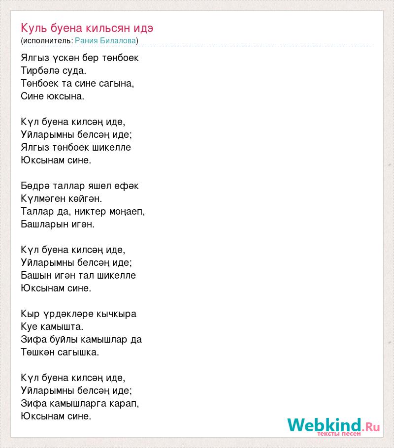 Ялгыз үскән бер төнбоек Тирбәлә суда. Төнбоек та сине сагына, Сине юксына. Күл буена килсәң иде, Уйларымны белсәң иде; Ялгыз төнбоек шикелле Юксынам сине. Бөдрә таллар яшел ефәк Күлмәген көйгән. Таллар да, никтер моңаеп, Башларын игән. Күл буена килсәң иде, Уйларымны белсәң иде; Башын игән тал шикелле Юксынам сине. Кыр үрдәкләре кычкыра Куе камышта. Зифа буйлы камышлар да Төшкән сагышка. Күл буена килсәң иде, Уйларымны белсәң иде; Зифа камышларга карап, Юксынам сине.