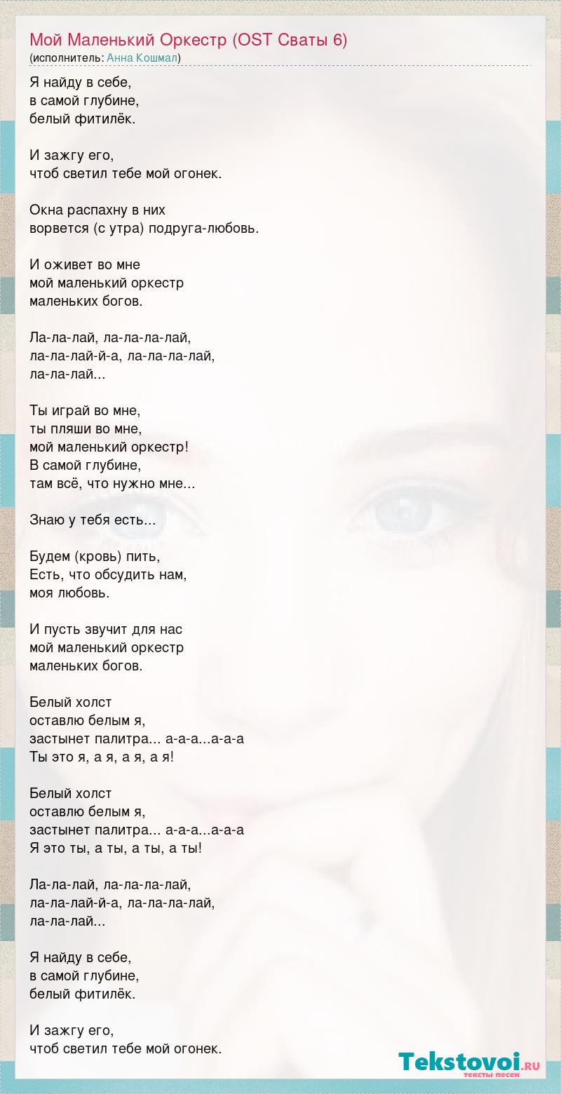 Я найду в себе, в самой глубине, белый фитилёк. И зажгу его, чтоб светил тебе мой огонек. Окна распахну в них ворвется (с утра) подруга-любовь. И оживет во мне мой маленький оркестр маленьких богов. Ла-ла-лай, ла-ла-ла-лай, ла-ла-лай-й-а, ла-ла-ла-лай, ла-ла-лай... Ты играй во мне, ты пляши во мне, мой маленький оркестр! В самой глубине, там всё, что нужно мне... Знаю у тебя есть... Будем (кровь) пить, Есть, что обсудить нам, моя любовь. И пусть звучит для нас мой маленький оркестр маленьких богов. Белый холст оставлю белым я, застынет палитра... а-а-а...а-а-а Ты это я, а я, а я, а я! Белый холст оставлю белым я, застынет палитра... а-а-а...а-а-а Я это ты, а ты, а ты, а ты! Ла-ла-лай, ла-ла-ла-лай, ла-ла-лай-й-а, ла-ла-ла-лай, ла-ла-лай... Я найду в себе, в самой глубине, белый фитилёк. И зажгу его, чтоб светил тебе мой огонек.