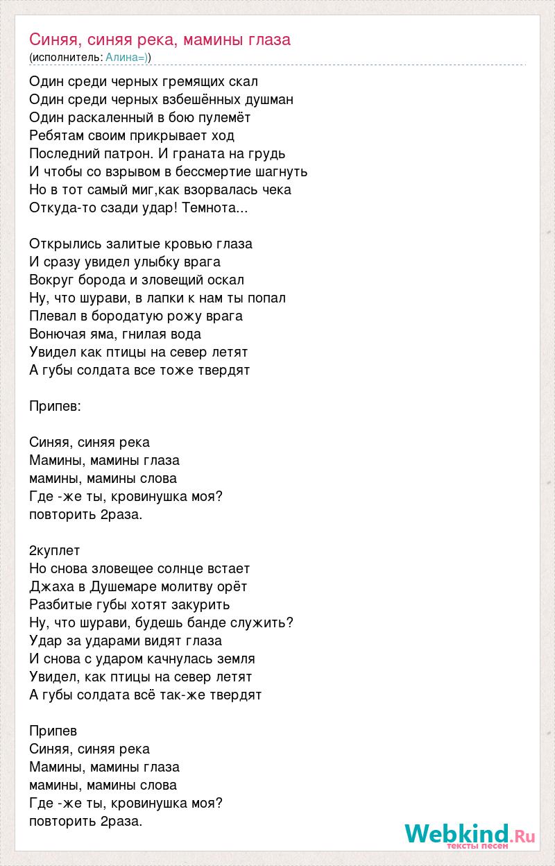 Один среди черных гремящих скал Один среди черных взбешённых душман Один раскаленный в бою пулемёт Ребятам своим прикрывает ход Последний патрон. И граната на грудь И чтобы со взрывом в бессмертие шагнуть Но в тот самый миг,как взорвалась чека Откуда-то сзади удар! Темнота... Открылись залитые кровью глаза И сразу увидел улыбку врага Вокруг борода и зловещий оскал Ну, что шурави, в лапки к нам ты попал Плевал в бородатую рожу врага Вонючая яма, гнилая вода Увидел как птицы на север летят А губы солдата все тоже твердят Припев: Синяя, синяя река Мамины, мамины глаза мамины, мамины слова Где -же ты, кровинушка моя? повторить 2раза. 2куплет Но снова зловещее солнце встает Джаха в Душемаре молитву орёт Разбитые губы хотят закурить Ну, что шурави, будешь банде служить? Удар за ударами видят глаза И снова с ударом качнулась земля Увидел, как птицы на север летят А губы солдата всё так-же твердят Припев Синяя, синяя река Мамины, мамины глаза мамины, мамины слова Где -же ты, кровинушка моя? повторить 2раза.