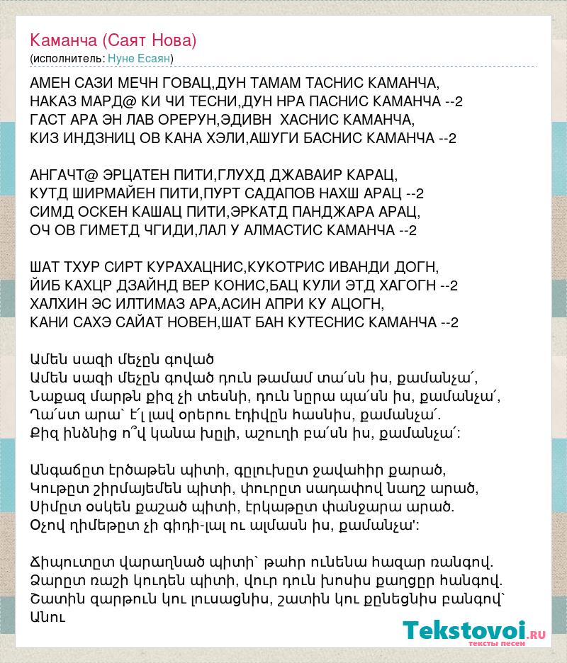 АМЕН САЗИ МЕЧН ГОВАЦ,ДУН ТАМАМ ТАСНИС КАМАНЧА, НАКАЗ МАРД@ КИ ЧИ ТЕСНИ,ДУН НРА ПАСНИС КАМАНЧА --2 ГАСТ АРА ЭН ЛАВ ОРЕРУН,ЭДИВН ХАСНИС КАМАНЧА, КИЗ ИНДЗНИЦ ОВ КАНА ХЭЛИ,АШУГИ БАСНИС КАМАНЧА --2 АНГАЧТ@ ЭРЦАТЕН ПИТИ,ГЛУХД ДЖАВАИР КАРАЦ, КУТД ШИРМАЙЕН ПИТИ,ПУРТ САДАПОВ НАХШ АРАЦ --2 СИМД ОСКЕН КАШАЦ ПИТИ,ЭРКАТД ПАНДЖАРА АРАЦ, ОЧ ОВ ГИМЕТД ЧГИДИ,ЛАЛ У АЛМАСТИС КАМАНЧА --2 ШАТ ТХУР СИРТ КУРАХАЦНИС,КУКОТРИС ИВАНДИ ДОГН, ЙИБ КАХЦР ДЗАЙНД ВЕР КОНИС,БАЦ КУЛИ ЭТД ХАГОГН --2 ХАЛХИН ЭС ИЛТИМАЗ АРА,АСИН АПРИ КУ АЦОГН, КАНИ САХЭ САЙАТ НОВЕН,ШАТ БАН КУТЕСНИС КАМАНЧА --2 Ամեն սազի մեչըն գոված Ամեն սազի մեչըն գոված դուն թամամ տա՛սն իս, քամանչա՛, Նաքազ մարթն քիզ չի տեսնի, դուն նըրա պա՛սն իս, քամանչա՛, Ղա՛ստ արա` է՛լ լավ օրերու էդիվըն հասնիս, քամանչա՛. Քիզ ինձնից ո՞վ կանա խըլի, աշուղի բա՛սն իս, քամանչա՛: Անգաճըտ էրծաթեն պիտի, գըլուխըտ ջավահիր քարած, Կութըտ շիրմայեմեն պիտի, փուրըտ սադափով նաղշ արած, Սիմըտ օսկեն քաշած պիտի, էրկաթըտ փանջարա արած. Օչով ղիմեթըտ չի գիդի-լալ ու ալմասն իս, քամանչա': Ճիպուտըտ վարաղնած պիտի` թահր ունենա հազար ռանգով. Ձարըտ ռաշի կուդեն պիտի, վուր դուն խոսիս քաղցըր հանգով. Շատին զարթուն կու լուսացնիս, շատին կու քընեցնիս բանգով` Անու