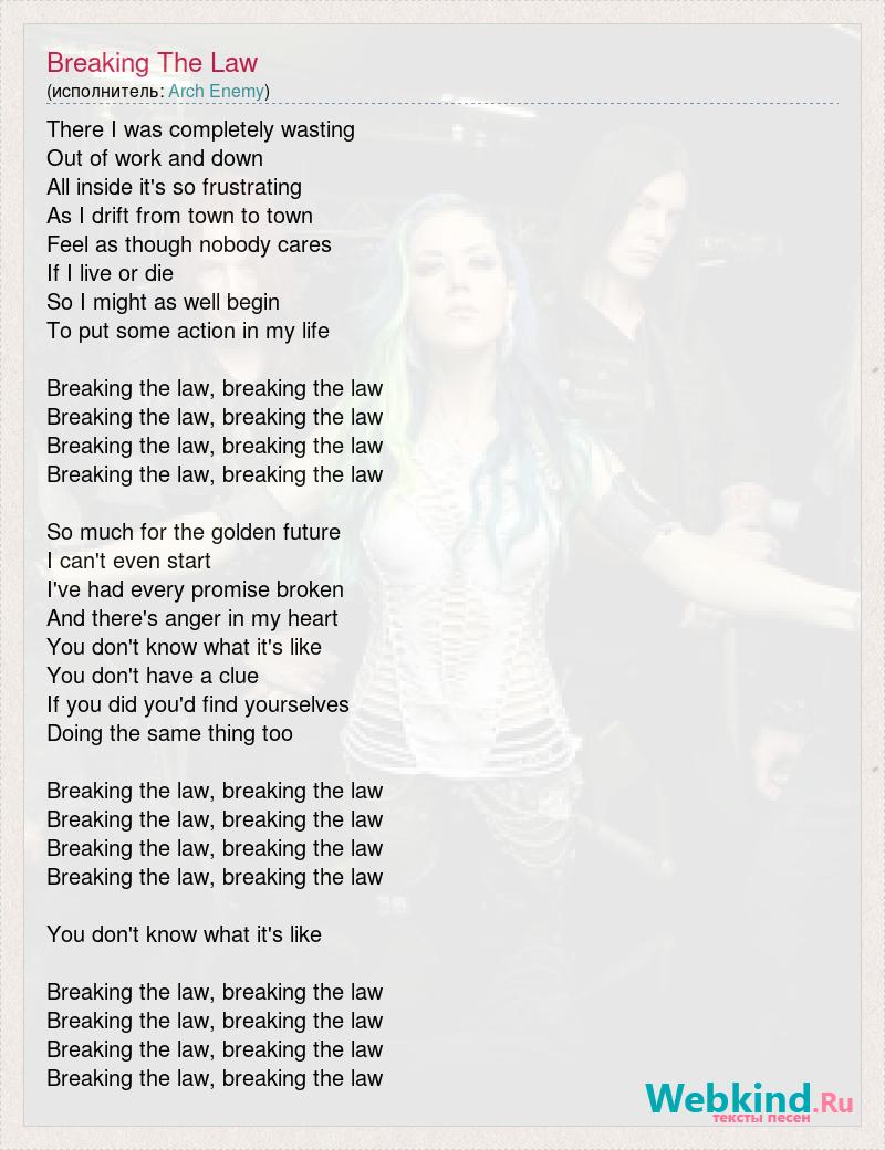 There I was completely wasting Out of work and down All inside it's so frustrating As I drift from town to town Feel as though nobody cares If I live or die So I might as well begin To put some action in my life Breaking the law, breaking the law Breaking the law, breaking the law Breaking the law, breaking the law Breaking the law, breaking the law So much for the golden future I can't even start I've had every promise broken And there's anger in my heart You don't know what it's like You don't have a clue If you did you'd find yourselves Doing the same thing too Breaking the law, breaking the law Breaking the law, breaking the law Breaking the law, breaking the law Breaking the law, breaking the law You don't know what it's like Breaking the law, breaking the law Breaking the law, breaking the law Breaking the law, breaking the law Breaking the law, breaking the law