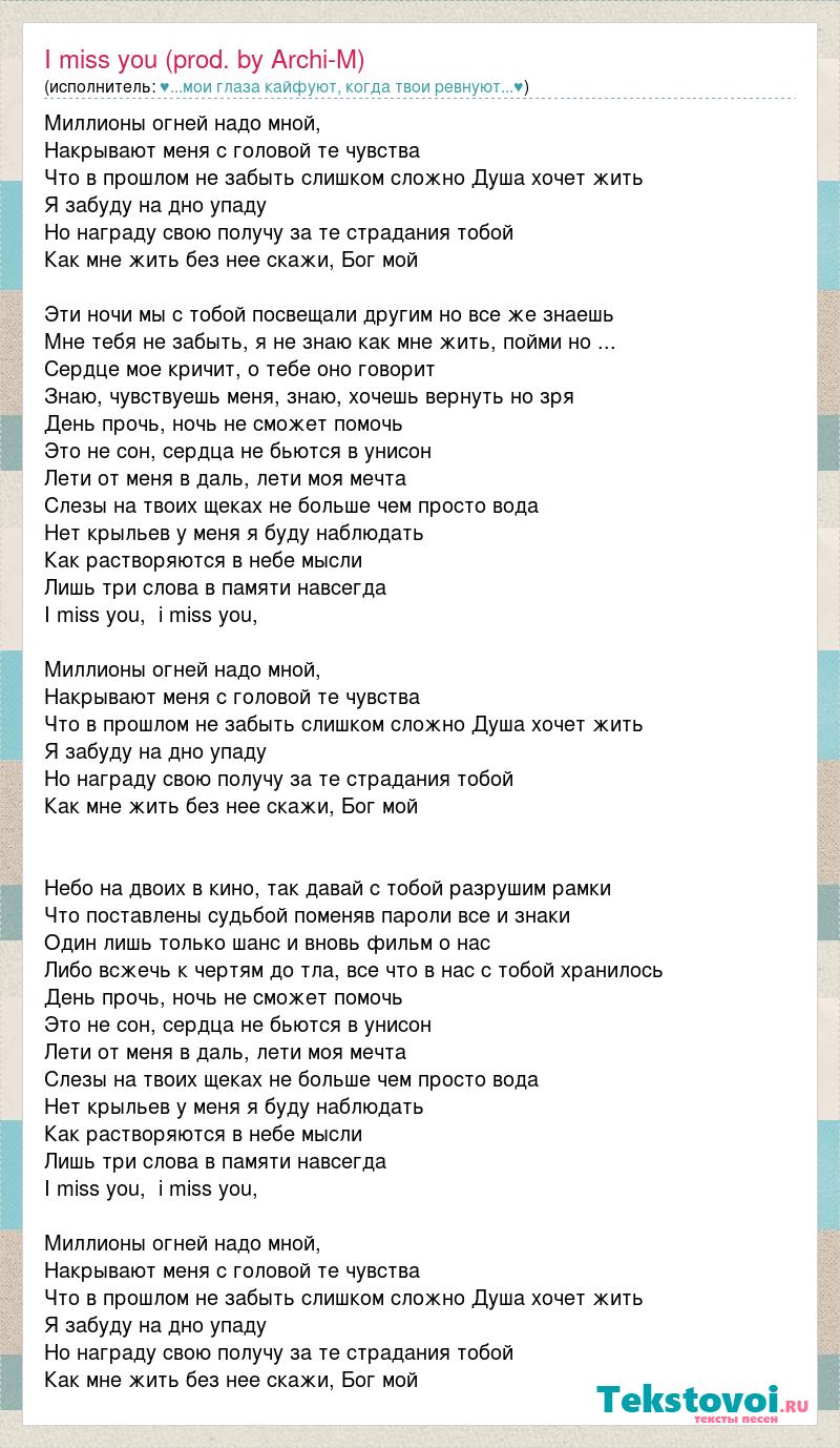 Миллионы огней надо мной, Накрывают меня с головой те чувства Что в прошлом не забыть слишком сложно Душа хочет жить Я забуду на дно упаду Но награду свою получу за те страдания тобой Как мне жить без нее скажи, Бог мой Эти ночи мы с тобой посвещали другим но все же знаешь Мне тебя не забыть, я не знаю как мне жить, пойми но ... Сердце мое кричит, о тебе оно говорит Знаю, чувствуешь меня, знаю, хочешь вернуть но зря День прочь, ночь не сможет помочь Это не сон, сердца не бьются в унисон Лети от меня в даль, лети моя мечта Слезы на твоих щеках не больше чем просто вода Нет крыльев у меня я буду наблюдать Как растворяются в небе мысли Лишь три слова в памяти навсегда I miss you, i miss you, Миллионы огней надо мной, Накрывают меня с головой те чувства Что в прошлом не забыть слишком сложно Душа хочет жить Я забуду на дно упаду Но награду свою получу за те страдания тобой Как мне жить без нее скажи, Бог мой Небо на двоих в кино, так давай с тобой разрушим рамки Что поставлены судьбой поменяв пароли все и знаки Один лишь только шанс и вновь фильм о нас Либо всжечь к чертям до тла, все что в нас с тобой хранилось День прочь, ночь не сможет помочь Это не сон, сердца не бьются в унисон Лети от меня в даль, лети моя мечта Слезы на твоих щеках не больше чем просто вода Нет крыльев у меня я буду наблюдать Как растворяются в небе мысли Лишь три слова в памяти навсегда I miss you, i miss you, Миллионы огней надо мной, Накрывают меня с головой те чувства Что в прошлом не забыть слишком сложно Душа хочет жить Я забуду на дно упаду Но награду свою получу за те страдания тобой Как мне жить без нее скажи, Бог мой