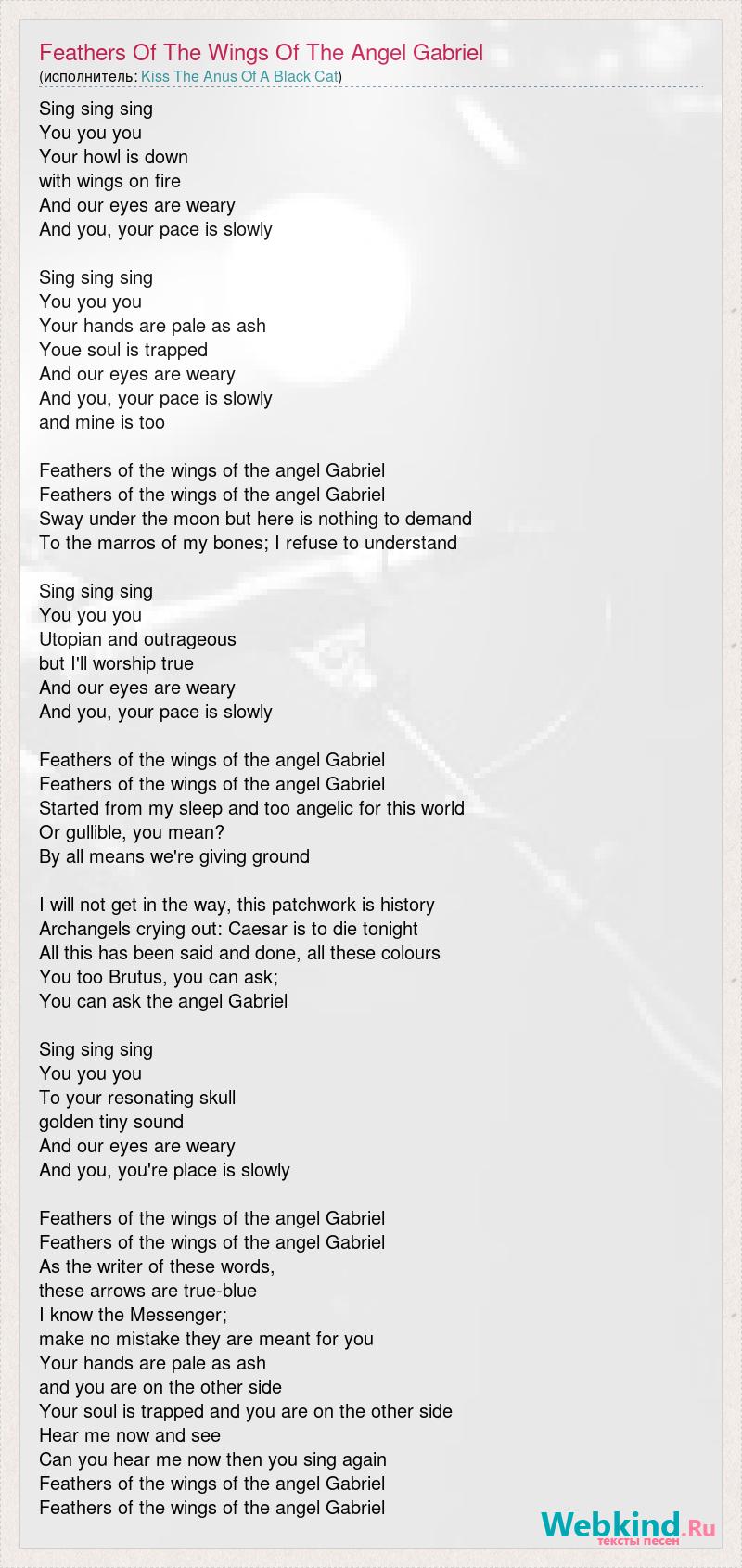 Sing sing sing You you you Your howl is down with wings on fire And our eyes are weary And you, your pace is slowly Sing sing sing You you you Your hands are pale as ash Youe soul is trapped And our eyes are weary And you, your pace is slowly and mine is too Feathers of the wings of the angel Gabriel Feathers of the wings of the angel Gabriel Sway under the moon but here is nothing to demand To the marros of my bones; I refuse to understand Sing sing sing You you you Utopian and outrageous but I'll worship true And our eyes are weary And you, your pace is slowly Feathers of the wings of the angel Gabriel Feathers of the wings of the angel Gabriel Started from my sleep and too angelic for this world Or gullible, you mean? By all means we're giving ground I will not get in the way, this patchwork is history Archangels crying out: Caesar is to die tonight All this has been said and done, all these colours You too Brutus, you can ask; You can ask the angel Gabriel Sing sing sing You you you To your resonating skull golden tiny sound And our eyes are weary And you, you're place is slowly Feathers of the wings of the angel Gabriel Feathers of the wings of the angel Gabriel As the writer of these words, these arrows are true-blue I know the Messenger; make no mistake they are meant for you Your hands are pale as ash and you are on the other side Your soul is trapped and you are on the other side Hear me now and see Can you hear me now then you sing again Feathers of the wings of the angel Gabriel Feathers of the wings of the angel Gabriel