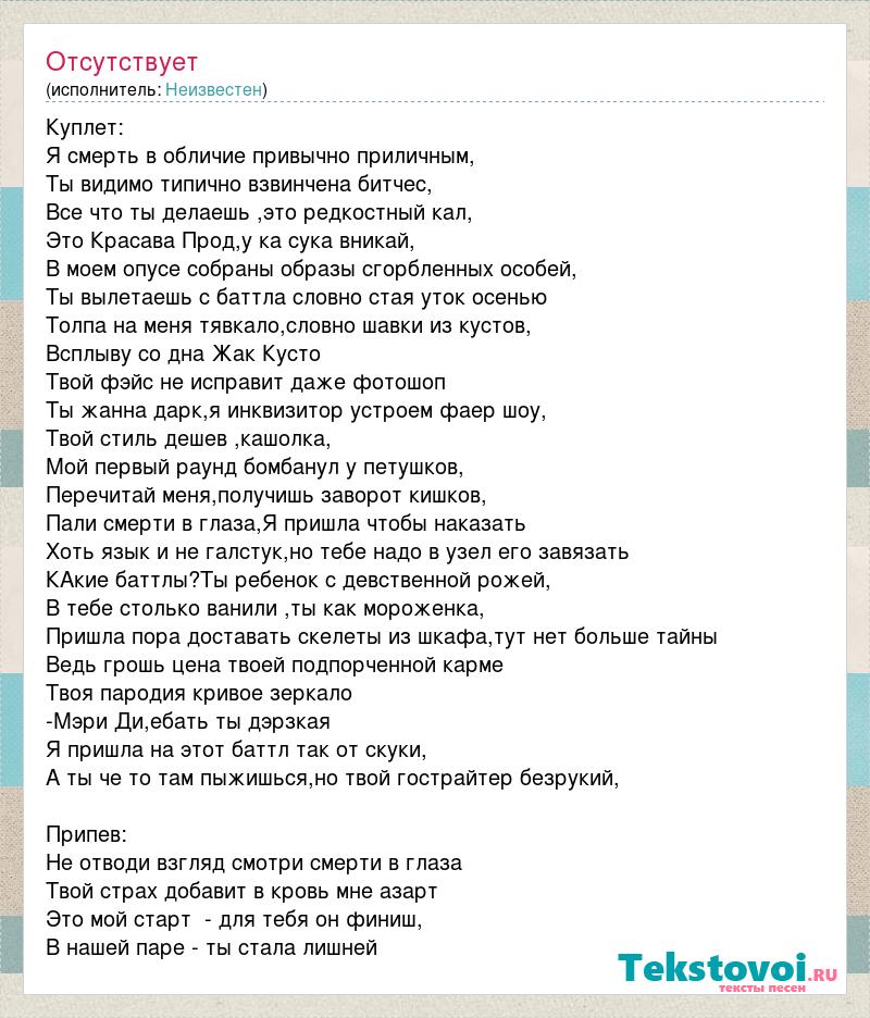 Куплет: Я смерть в обличие привычно приличным, Ты видимо типично взвинчена битчес, Все что ты делаешь ,это редкостный кал, Это Красава Прод,у ка сука вникай, В моем опусе собраны образы сгорбленных особей, Ты вылетаешь с баттла словно стая уток осенью Толпа на меня тявкало,словно шавки из кустов, Всплыву со дна Жак Кусто Твой фэйс не исправит даже фотошоп Ты жанна дарк,я инквизитор устроем фаер шоу, Твой стиль дешев ,кашолка, Мой первый раунд бомбанул у петушков, Перечитай меня,получишь заворот кишков, Пали смерти в глаза,Я пришла чтобы наказать Хоть язык и не галстук,но тебе надо в узел его завязать КАкие баттлы?Ты ребенок с девственной рожей, В тебе столько ванили ,ты как мороженка, Пришла пора доставать скелеты из шкафа,тут нет больше тайны Ведь грошь цена твоей подпорченной карме Твоя пародия кривое зеркало -Мэри Ди,ебать ты дэрзкая Я пришла на этот баттл так от скуки, А ты че то там пыжишься,но твой гострайтер безрукий, Припев: Не отводи взгляд смотри смерти в глаза Твой страх добавит в кровь мне азарт Это мой старт - для тебя он финиш, В нашей паре - ты стала лишней