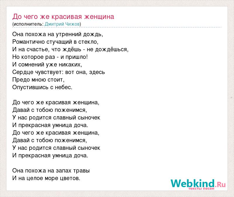Она похожа на утренний дождь, Романтично стучащий в стекло, И на счастье, что ждёшь - не дождёшься, Но которое раз - и пришло! И сомнений уже никаких, Сердце чувствует: вот она, здесь Предо мною стоит, Опустившись с небес. До чего же красивая женщина, Давай с тобою поженимся, У нас родится славный сыночек И прекрасная умница доча. До чего же красивая женщина, Давай с тобою поженимся, У нас родится славный сыночек И прекрасная умница доча. Она похожа на запах травы И на целое море цветов.