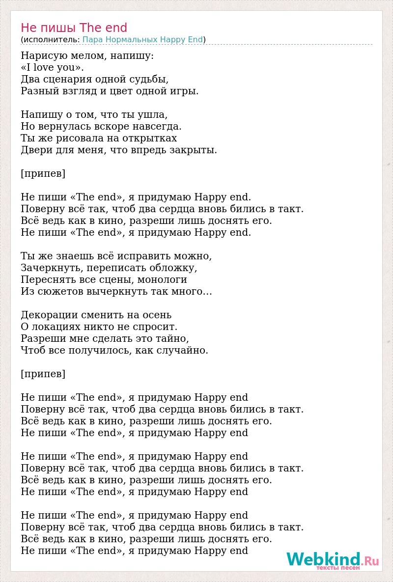 Нарисую мелом, напишу: «I love you». Два сценария одной судьбы, Разный взгляд и цвет одной игры. Напишу о том, что ты ушла, Но вернулась вскоре навсегда. Ты же рисовала на открытках Двери для меня, что впредь закрыты. [припев] Не пиши «The end», я придумаю Happy end. Поверну всё так, чтоб два сердца вновь бились в такт. Всё ведь как в кино, разреши лишь доснять его. Не пиши «The end», я придумаю Happy end. Ты же знаешь всё исправить можно, Зачеркнуть, переписать обложку, Переснять все сцены, монологи Из сюжетов вычеркнуть так много… Декорации сменить на осень О локациях никто не спросит. Разреши мне сделать это тайно, Чтоб все получилось, как случайно. [припев] Не пиши «The end», я придумаю Happy end Поверну всё так, чтоб два сердца вновь бились в такт. Всё ведь как в кино, разреши лишь доснять его. Не пиши «The end», я придумаю Happy end Не пиши «The end», я придумаю Happy end Поверну всё так, чтоб два сердца вновь бились в такт. Всё ведь как в кино, разреши лишь доснять его. Не пиши «The end», я придумаю Happy end Не пиши «The end», я придумаю Happy end Поверну всё так, чтоб два сердца вновь бились в такт. Всё ведь как в кино, разреши лишь доснять его. Не пиши «The end», я придумаю Happy end