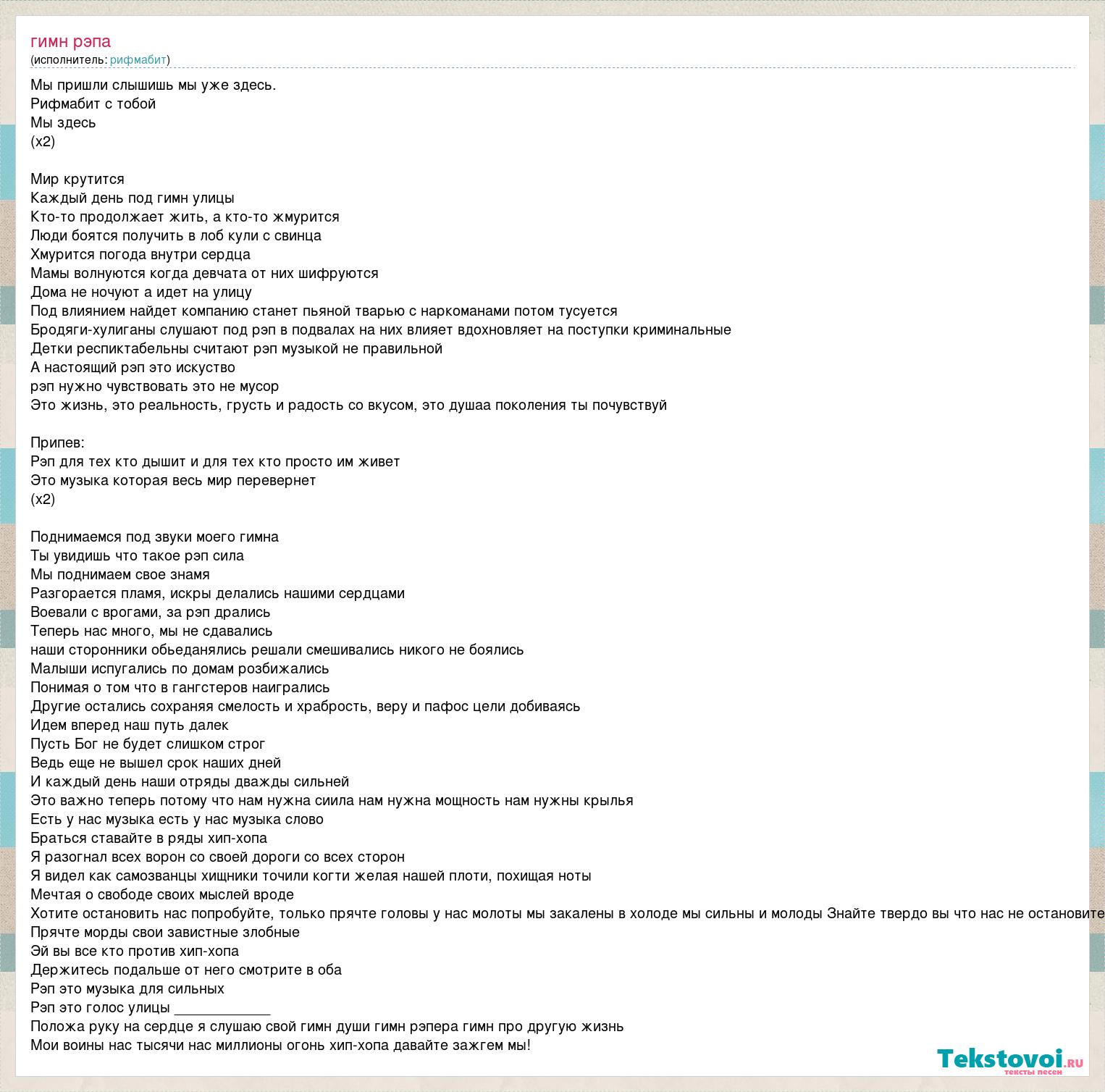 Мы пришли слышишь мы уже здесь. Рифмабит с тобой Мы здесь (х2) Мир крутится Каждый день под гимн улицы Кто-то продолжает жить, а кто-то жмурится Люди боятся получить в лоб кули с свинца Хмурится погода внутри сердца Мамы волнуются когда девчата от них шифруются Дома не ночуют а идет на улицу Под влиянием найдет компанию станет пьяной тварью с наркоманами потом тусуется Бродяги-хулиганы слушают под рэп в подвалах на них влияет вдохновляет на поступки криминальные Детки респиктабельны считают рэп музыкой не правильной А настоящий рэп это искуство рэп нужно чувствовать это не мусор Это жизнь, это реальность, грусть и радость со вкусом, это душаа поколения ты почувствуй Припев: Рэп для тех кто дышит и для тех кто просто им живет Это музыка которая весь мир перевернет (х2) Поднимаемся под звуки моего гимна Ты увидишь что такое рэп сила Мы поднимаем свое знамя Разгорается пламя, искры делались нашими сердцами Воевали с врогами, за рэп дрались Теперь нас много, мы не сдавались наши сторонники обьеданялись решали смешивались никого не боялись Малыши испугались по домам розбижались Понимая о том что в гангстеров наигрались Другие остались сохраняя смелость и храбрость, веру и пафос цели добиваясь Идем вперед наш путь далек Пусть Бог не будет слишком строг Ведь еще не вышел срок наших дней И каждый день наши отряды дважды сильней Это важно теперь потому что нам нужна сиила нам нужна мощность нам нужны крылья Есть у нас музыка есть у нас музыка слово Браться ставайте в ряды хип-хопа Я разогнал всех ворон со своей дороги со всех сторон Я видел как самозванцы хищники точили когти желая нашей плоти, похищая ноты Мечтая о свободе своих мыслей вроде Хотите остановить нас попробуйте, только прячте головы у нас молоты мы закалены в холоде мы сильны и молоды Знайте твердо вы что нас не остановите Прячте морды свои завистные злобные Эй вы все кто против хип-хопа Держитесь подальше от него смотрите в оба Рэп это музыка для сильных Рэп это голос улицы ____________ Положа руку на сердце я слушаю свой гимн души гимн рэпера гимн про другую жизнь Мои воины нас тысячи нас миллионы огонь хип-хопа давайте зажгем мы!