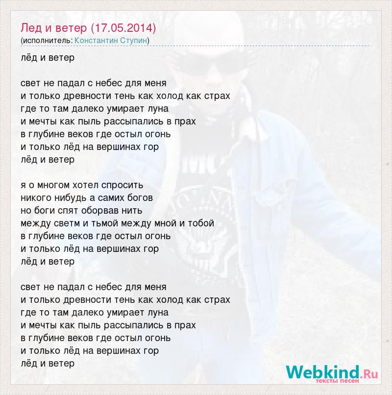 лёд и ветер свет не падал с небес для меня и только древности тень как холод как страх где то там далеко умирает луна и мечты как пыль рассыпались в прах в глубине веков где остыл огонь и только лёд на вершинах гор лёд и ветер я о многом хотел спросить никого нибудь а самих богов но боги спят оборвав нить между светм и тьмой между мной и тобой в глубине веков где остыл огонь и только лёд на вершинах гор лёд и ветер свет не падал с небес для меня и только древности тень как холод как страх где то там далеко умирает луна и мечты как пыль рассыпались в прах в глубине веков где остыл огонь и только лёд на вершинах гор лёд и ветер