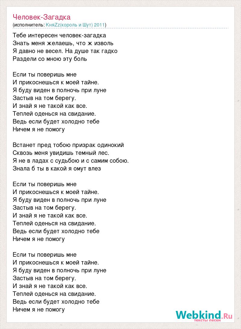 Тебе интересен человек-загадка Знать меня желаешь, что ж изволь Я давно не весел. На душе так гадко Раздели со мною эту боль Если ты поверишь мне И прикоснешься к моей тайне. Я буду виден в полночь при луне Застыв на том берегу. И знай я не такой как все. Теплей оденься на свидание. Ведь если будет холодно тебе Ничем я не помогу Встанет пред тобою призрак одинокий Сквозь меня увидишь темный лес. Я не в ладах с судьбою и с самим собою. Знала б ты в какой я омут влез Если ты поверишь мне И прикоснешься к моей тайне. Я буду виден в полночь при луне Застыв на том берегу. И знай я не такой как все. Теплей оденься на свидание. Ведь если будет холодно тебе Ничем я не помогу Если ты поверишь мне И прикоснешься к моей тайне. Я буду виден в полночь при луне Застыв на том берегу. И знай я не такой как все. Теплей оденься на свидание. Ведь если будет холодно тебе Ничем я не помогу