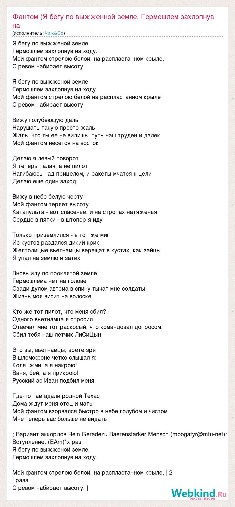 Главная→Исполнители→Чиж&Co→Фантом (Я бегу по выжженной земле, Гермошлем захлопнув на ходу. Мой Фантом с стр