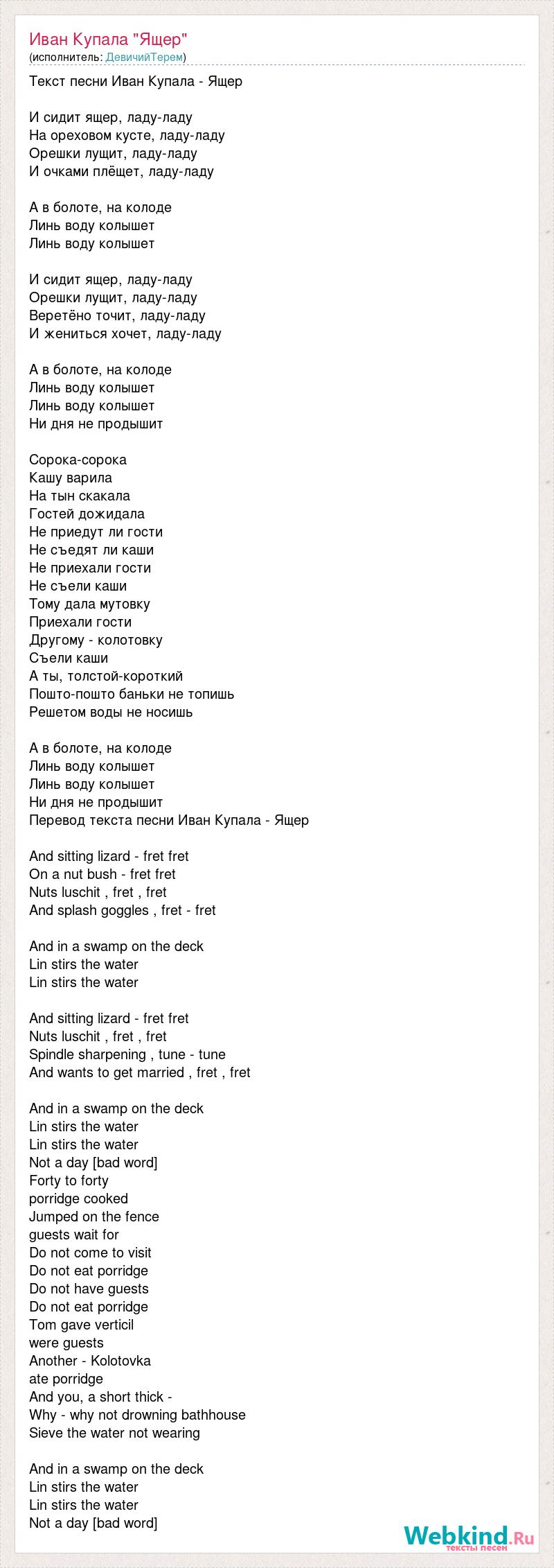 Текст песни Иван Купала - Ящер И сидит ящер, ладу-ладу На ореховом кусте, ладу-ладу Орешки лущит, ладу-ладу И очками плёщет, ладу-ладу А в болоте, на колоде Линь воду колышет Линь воду колышет И сидит ящер, ладу-ладу Орешки лущит, ладу-ладу Веретёно точит, ладу-ладу И жениться хочет, ладу-ладу А в болоте, на колоде Линь воду колышет Линь воду колышет Ни дня не продышит Сорока-сорока Кашу варила На тын скакала Гостей дожидала Не приедут ли гости Не съедят ли каши Не приехали гости Не съели каши Тому дала мутовку Приехали гости Другому - колотовку Съели каши А ты, толстой-короткий Пошто-пошто баньки не топишь Решетом воды не носишь А в болоте, на колоде Линь воду колышет Линь воду колышет Ни дня не продышит Перевод текста песни Иван Купала - Ящер And sitting lizard - fret fret On a nut bush - fret fret Nuts luschit , fret , fret And splash goggles , fret - fret And in a swamp on the deck Lin stirs the water Lin stirs the water And sitting lizard - fret fret Nuts luschit , fret , fret Spindle sharpening , tune - tune And wants to get married , fret , fret And in a swamp on the deck Lin stirs the water Lin stirs the water Not a day [bad word] Forty to forty porridge cooked Jumped on the fence guests wait for Do not come to visit Do not eat porridge Do not have guests Do not eat porridge Tom gave verticil were guests Another - Kolotovka ate porridge And you, a short thick - Why - why not drowning bathhouse Sieve the water not wearing And in a swamp on the deck Lin stirs the water Lin stirs the water Not a day [bad word]