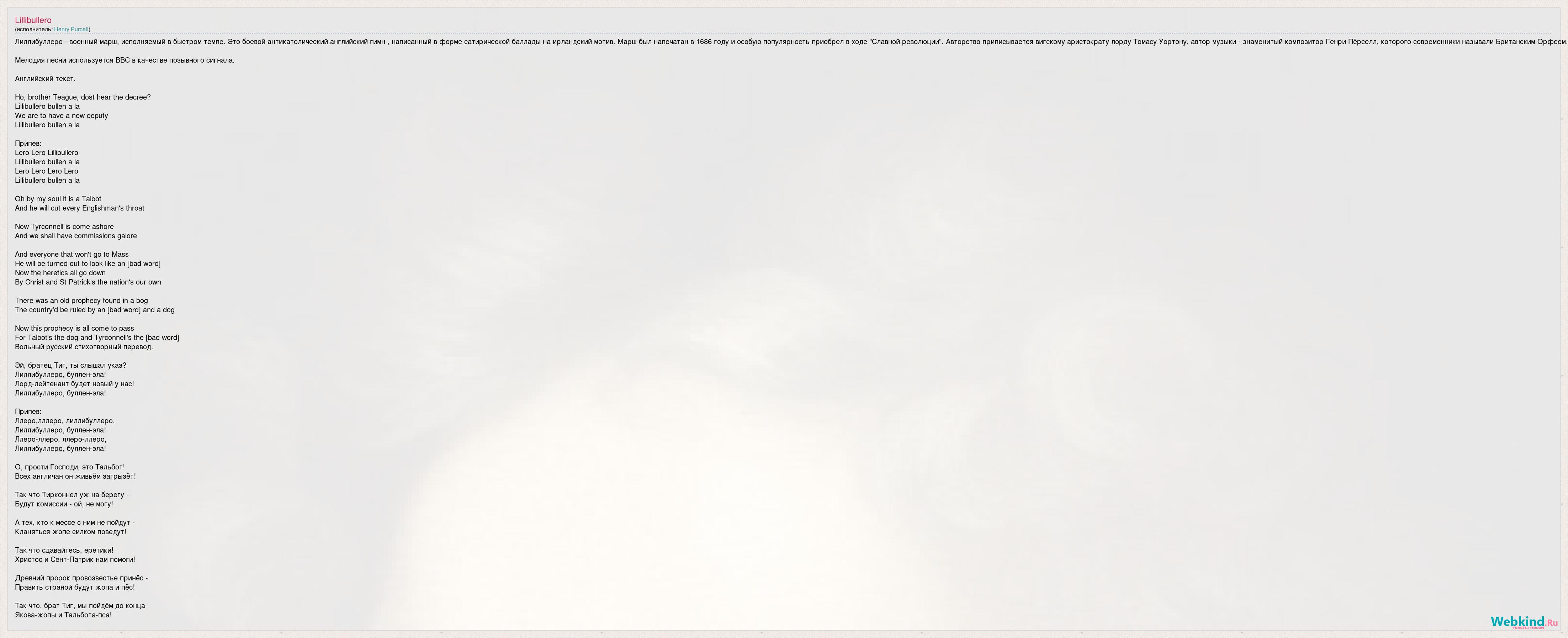 Лиллибуллеро - военный марш, исполняемый в быстром темпе. Это боевой антикатолический английский гимн , написанный в форме сатирической баллады на ирландский мотив. Марш был напечатан в 1686 году и особую популярность приобрел в ходе "Славной революции". Авторство приписывается вигскому аристократу лорду Томасу Уортону, автор музыки - знаменитый композитор Генри Пёрселл, которого современники называли Британским Орфеем. Мелодия песни используется BBC в качестве позывного сигнала. Английский текст. Ho, brother Teague, dost hear the decree? Lillibullero bullen a la We are to have a new deputy Lillibullero bullen a la Припев: Lero Lero Lillibullero Lillibullero bullen a la Lero Lero Lero Lero Lillibullero bullen a la Oh by my soul it is a Talbot And he will cut every Englishman's throat Now Tyrconnell is come ashore And we shall have commissions galore And everyone that won't go to Mass He will be turned out to look like an [bad word] Now the heretics all go down By Christ and St Patrick's the nation's our own There was an old prophecy found in a bog The country'd be ruled by an [bad word] and a dog Now this prophecy is all come to pass For Talbot's the dog and Tyrconnell's the [bad word] Вольный русский стихотворный перевод. Эй, братец Тиг, ты слышал указ? Лиллибуллеро, буллен-эла! Лорд-лейтенант будет новый у нас! Лиллибуллеро, буллен-эла! Припев: Ллеро,лллеро, лиллибуллеро, Лиллибуллеро, буллен-эла! Ллеро-ллеро, ллеро-ллеро, Лиллибуллеро, буллен-эла! О, прости Господи, это Тальбот! Всех англичан он живьём загрызёт! Так что Тирконнел уж на берегу - Будут комиссии - ой, не могу! А тех, кто к мессе с ним не пойдут - Кланяться жопе силком поведут! Так что сдавайтесь, еретики! Христос и Сент-Патрик нам помоги! Древний пророк провозвестье принёс - Править страной будут жопа и пёс! Так что, брат Тиг, мы пойдём до конца - Якова-жопы и Тальбота-пса!