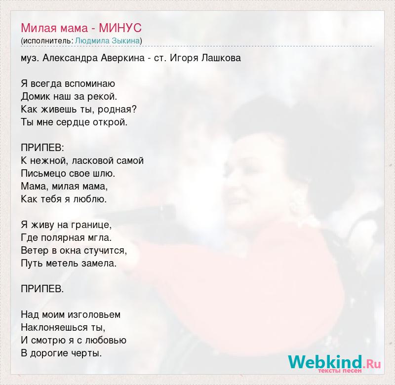 муз. Александра Аверкина - ст. Игоря Лашкова Я всегда вспоминаю Домик наш за рекой. Как живешь ты, родная? Ты мне сердце открой. ПРИПЕВ: К нежной, ласковой самой Письмецо свое шлю. Мама, милая мама, Как тебя я люблю. Я живу на границе, Где полярная мгла. Ветер в окна стучится, Путь метель замела. ПРИПЕВ. Над моим изголовьем Наклоняешься ты, И смотрю я с любовью В дорогие черты.