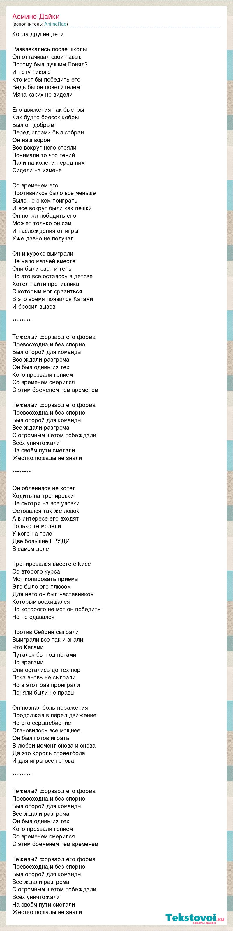 Когда другие дети Развлекались после школы Он оттачивал свои навык Потому был лучшим,Понял? И нету никого Кто мог бы победить его Ведь бы он повелителем Мяча каких не видели Его движения так быстры Как будто бросок кобры Был он добрым Перед играми был собран Он наш ворон Все вокруг него стояли Понимали то что гений Пали на колени перед ним Сидели на измене Со временем его Противников было все меньше Было не с кем поиграть И все вокруг были как пешки Он понял победить его Может только он сам И наслождения от игры Уже давно не получал Он и куроко выиграли Не мало матчей вместе Они были свет и тень Но это все осталось в детсве Хотел найти противника С которым мог сразиться В это время появился Кагами И бросил вызов ******** Тежелый форвард его форма Превосходна,и без спорно Был опорой для команды Все ждали разгрома Он был одним из тех Кого прозвали гением Со временем смерился С этим бременем тем временем Тежелый форвард его форма Превосходна,и без спорно Был опорой для команды Все ждали разгрома С огромным шетом побеждали Всех уничтожали На своём пути сметали Жестко,пощады не знали ******** Он обленился не хотел Ходить на тренировки Не смотря на все уловки Остовался так же ловок А в интересе его входят Только те модели У кого на теле Две большие ГРУДИ В самом деле Тренировался вместе с Кисе Со второго курса Мог копировать приемы Это было его плюсом Для него он был наставником Которым восхищался Но которого не мог он победить Но не сдавался Против Сейрин сыграли Выиграли все так и знали Что Кагами Путался бы под ногами Но врагами Они остались до тех пор Пока вновь не сыграли Но в этот раз проиграли Поняли,были не правы Он познал боль поражения Продолжал в перед движение Но его сердцебиение Становилось все мощнее Он был готов играть В любой момент снова и снова Да это король стреетбола И для игры все готова ******** Тежелый форвард его форма Превосходна,и без спорно Был опорой для команды Все ждали разгрома Он был одним из тех Кого прозвали гением Со временем смерился С этим бременем тем временем Тежелый форвард его форма Превосходна,и без спорно Был опорой для команды Все ждали разгрома С огромным шетом побеждали Всех уничтожали На своём пути сметали Жестко,пощады не знали