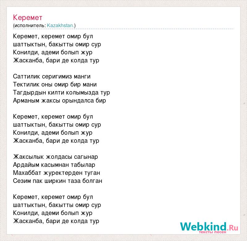 Керемет, керемет омир бул шаттыктын, бакытты омир сур Конилди, адеми болып жур Жасканба, бари де колда тур Саттилик серигимиз манги Тектилик оны омир бир мани Тагдырдын килти колымызда тур Арманым жаксы орындалса бир Керемет, керемет омир бул шаттыктын, бакытты омир сур Конилди, адеми болып жур Жасканба, бари де колда тур Жаксылык жолдасы сагынар Ардайым касымнан табылар Махаббат журектерден туган Сезим пак ширкин таза болган Керемет, керемет омир бул шаттыктын, бакытты омир сур Конилди, адеми болып жур Жасканба, бари де колда тур