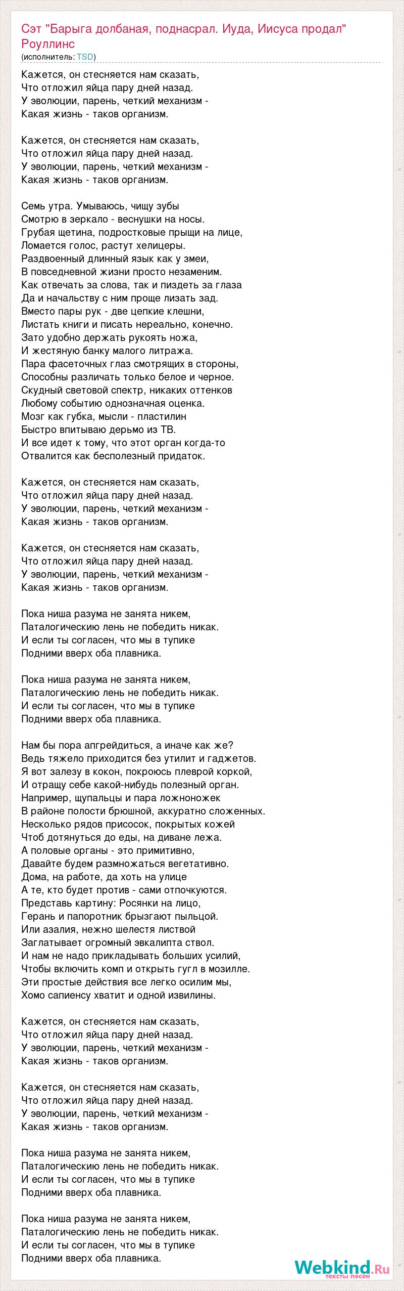 А как ты думаешь, о чем песня "Сэт "Барыга долбаная, поднасрал. Иуда, Иисуса продал" Роуллинс" ?