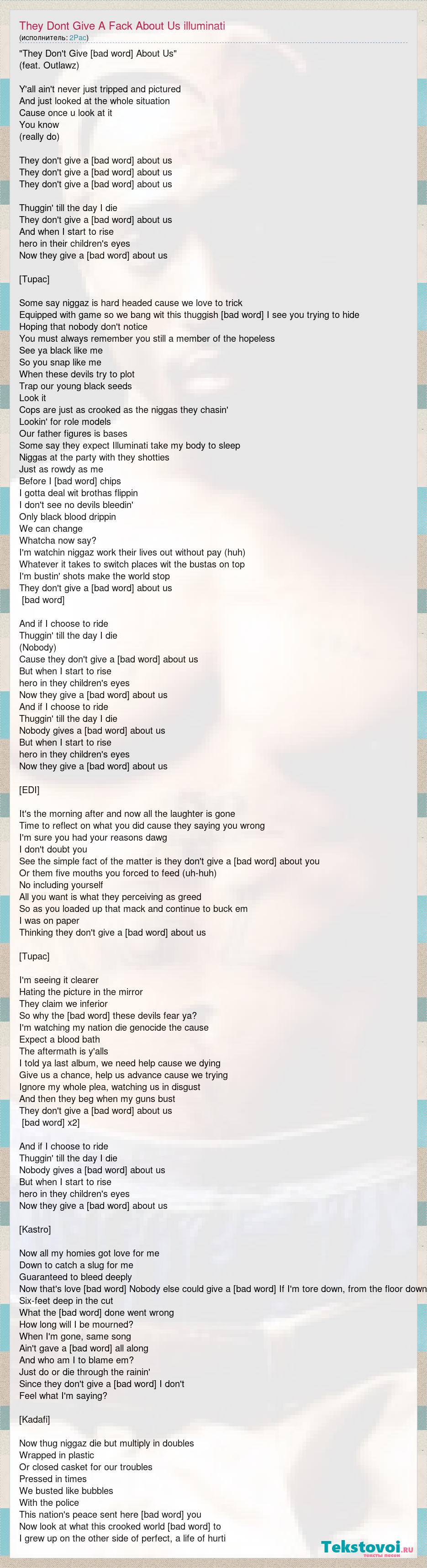 "They Don't Give [bad word] About Us" (feat. Outlawz) Y'all ain't never just tripped and pictured And just looked at the whole situation Cause once u look at it You know (really do) They don't give a [bad word] about us They don't give a [bad word] about us They don't give a [bad word] about us Thuggin' till the day I die They don't give a [bad word] about us And when I start to rise hero in their children's eyes Now they give a [bad word] about us [Tupac] Some say niggaz is hard headed cause we love to trick Equipped with game so we bang wit this thuggish [bad word] I see you trying to hide Hoping that nobody don't notice You must always remember you still a member of the hopeless See ya black like me So you snap like me When these devils try to plot Trap our young black seeds Look it Cops are just as crooked as the niggas they chasin' Lookin' for role models Our father figures is bases Some say they expect Illuminati take my body to sleep Niggas at the party with they shotties Just as rowdy as me Before I flee computer chips I gotta deal wit brothas flippin I don't see no devils bleedin' Only black blood drippin We can change Whatcha now say? I'm watchin niggaz work their lives out without pay (huh) Whatever it takes to switch places wit the bustas on top I'm bustin' shots make the world stop They don't give a [bad word] about us [Chorus] And if I choose to ride Thuggin' till the day I die (Nobody) Cause they don't give a [bad word] about us But when I start to rise hero in they children's eyes Now they give a [bad word] about us And if I choose to ride Thuggin' till the day I die Nobody gives a [bad word] about us But when I start to rise hero in they children's eyes Now they give a [bad word] about us [EDI] It's the morning after and now all the laughter is gone Time to reflect on what you did cause they saying you wrong I'm sure you had your reasons dawg I don't doubt you See the simple fact of the matter is they don't give a [bad word] about you Or them five mouths you forced to feed (uh-huh) No including yourself All you want is what they perceiving as greed So as you loaded up that mack and continue to buck em I was on paper Thinking they don't give a [bad word] about us [Tupac] I'm seeing it clearer Hating the picture in the mirror They claim we inferior So why the [bad word] these devils fear ya? I'm watching my nation die genocide the cause Expect a blood bath The aftermath is y'alls I told ya last album, we need help cause we dying Give us a chance, help us advance cause we trying Ignore my whole plea, watching us in disgust And then they beg when my guns bust They don't give a [bad word] about us [Chorus x2] And if I choose to ride Thuggin' till the day I die Nobody gives a [bad word] about us But when I start to rise hero in they children's eyes Now they give a [bad word] about us [Kastro] Now all my homies got love for me Down to catch a slug for me Guaranteed to bleed deeply Now that's love [bad word] Nobody else could give a [bad word] If I'm tore down, from the floor down Six-feet deep in the cut What the [bad word] done went wrong How long will I be mourned? When I'm gone, same song Ain't gave a [bad word] all along And who am I to blame em? Just do or die through the rainin' Since they don't give a [bad word] I don't Feel what I'm saying? [Kadafi] Now thug niggaz die but multiply in doubles Wrapped in plastic Or closed casket for our troubles Pressed in times We busted like bubbles With the police This nation's peace sent here to run you Now look at what this crooked world has come to I grew up on the other side of perfect, a life of hurti