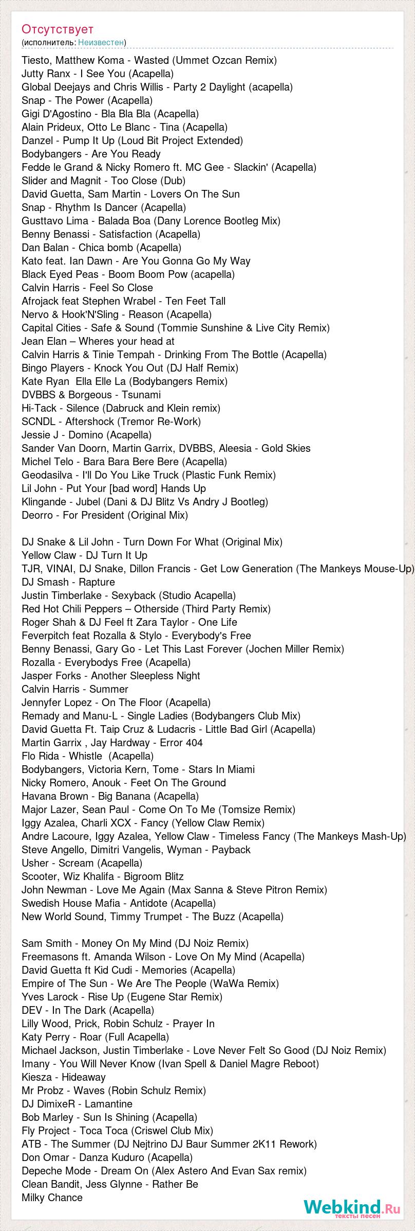 Tiesto, Matthew Koma - Wasted (Ummet Ozcan Remix) Jutty Ranx - I See You (Acapella) Global Deejays and Chris Willis - Party 2 Daylight (acapella) Snap - The Power (Acapella) Gigi D'Agostino - Bla Bla Bla (Acapella) Alain Prideux, Otto Le Blanc - Tina (Acapella) Danzel - Pump It Up (Loud Bit Project Extended) Bodybangers - Are You Ready Fedde le Grand & Nicky Romero ft. MC Gee - Slackin' (Acapella) Slider and Magnit - Too Close (Dub) David Guetta, Sam Martin - Lovers On The Sun Snap - Rhythm Is Dancer (Acapella) Gusttavo Lima - Balada Boa (Dany Lorence Bootleg Mix) Benny Benassi - Satisfaction (Acapella) Dan Balan - Chica bomb (Acapella) Kato feat. Ian Dawn - Are You Gonna Go My Way Black Eyed Peas - Boom Boom Pow (acapella) Calvin Harris - Feel So Close Afrojack feat Stephen Wrabel - Ten Feet Tall Nervo & Hook'N'Sling - Reason (Acapella) Capital Cities - Safe & Sound (Tommie Sunshine & Live City Remix) Jean Elan – Wheres your head at Calvin Harris & Tinie Tempah - Drinking From The Bottle (Acapella) Bingo Players - Knock You Out (DJ Half Remix) Kate Ryan Ella Elle La (Bodybangers Remix) DVBBS & Borgeous - Tsunami Hi-Tack - Silence (Dabruck and Klein remix) SCNDL - Aftershock (Tremor Re-Work) Jessie J - Domino (Acapella) Sander Van Doorn, Martin Garrix, DVBBS, Aleesia - Gold Skies Michel Telo - Bara Bara Bere Bere (Acapella) Geodasilva - I'll Do You Like Truck (Plastic Funk Remix) Lil John - Put Your [bad word] Hands Up Klingande - Jubel (Dani & DJ Blitz Vs Andry J Bootleg) Deorro - For President (Original Mix) DJ Snake & Lil John - Turn Down For What (Original Mix) Yellow Claw - DJ Turn It Up TJR, VINAI, DJ Snake, Dillon Francis - Get Low Generation (The Mankeys Mouse-Up) DJ Smash - Rapture Justin Timberlake - Sexyback (Studio Acapella) Red Hot Chili Peppers – Otherside (Third Party Remix) Roger Shah & DJ Feel ft Zara Taylor - One Life Feverpitch feat Rozalla & Stylo - Everybody's Free Benny Benassi, Gary Go - Let This Last Forever (Jochen Miller Remix) Rozalla - Everybodys Free (Acapella) Jasper Forks - Another Sleepless Night Calvin Harris - Summer Jennyfer Lopez - On The Floor (Acapella) Remady and Manu-L - Single Ladies (Bodybangers Club Mix) David Guetta Ft. Taip Cruz & Ludacris - Little Bad Girl (Acapella) Martin Garrix , Jay Hardway - Error 404 Flo Rida - Whistle (Acapella) Bodybangers, Victoria Kern, Tome - Stars In Miami Nicky Romero, Anouk - Feet On The Ground Havana Brown - Big Banana (Acapella) Major Lazer, Sean Paul - Come On To Me (Tomsize Remix) Iggy Azalea, Charli XCX - Fancy (Yellow Claw Remix) Andre Lacoure, Iggy Azalea, Yellow Claw - Timeless Fancy (The Mankeys Mash-Up) Steve Angello, Dimitri Vangelis, Wyman - Payback Usher - Scream (Acapella) Scooter, Wiz Khalifa - Bigroom Blitz John Newman - Love Me Again (Max Sanna & Steve Pitron Remix) Swedish House Mafia - Antidote (Acapella) New World Sound, Timmy Trumpet - The Buzz (Acapella) Sam Smith - Money On My Mind (DJ Noiz Remix) Freemasons ft. Amanda Wilson - Love On My Mind (Acapella) David Guetta ft Kid Cudi - Memories (Acapella) Empire of The Sun - We Are The People (WaWa Remix) Yves Larock - Rise Up (Eugene Star Remix) DEV - In The Dark (Acapella) Lilly Wood, Prick, Robin Schulz - Prayer In Katy Perry - Roar (Full Acapella) Michael Jackson, Justin Timberlake - Love Never Felt So Good (DJ Noiz Remix) Imany - You Will Never Know (Ivan Spell & Daniel Magre Reboot) Kiesza - Hideaway Mr Probz - Waves (Robin Schulz Remix) DJ DimixeR - Lamantine Bob Marley - Sun Is Shining (Acapella) Fly Project - Toca Toca (Criswel Club Mix) ATB - The Summer (DJ Nejtrino DJ Baur Summer 2K11 Rework) Don Omar - Danza Kuduro (Acapella) Depeche Mode - Dream On (Alex Astero And Evan Sax remix) Clean Bandit, Jess Glynne - Rather Be Milky Chance