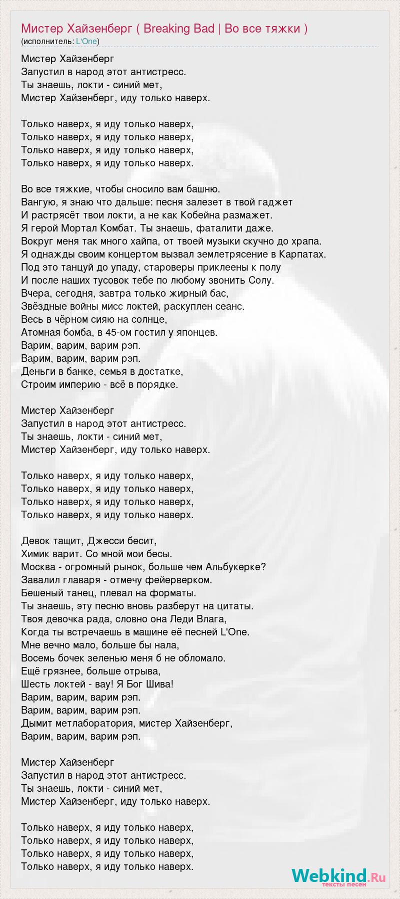 Мистер Хайзенберг Запустил в народ этот антистресс. Ты знаешь, локти - синий мет, Мистер Хайзенберг, иду только наверх. Только наверх, я иду только наверх, Только наверх, я иду только наверх, Только наверх, я иду только наверх, Только наверх, я иду только наверх. Во все тяжкие, чтобы сносило вам башню. Вангую, я знаю что дальше: песня залезет в твой гаджет И растрясёт твои локти, а не как Кобейна размажет. Я герой Мортал Комбат. Ты знаешь, фаталити даже. Вокруг меня так много хайпа, от твоей музыки скучно до храпа. Я однажды своим концертом вызвал землетрясение в Карпатах. Под это танцуй до упаду, староверы приклеены к полу И после наших тусовок тебе по любому звонить Солу. Вчера, сегодня, завтра только жирный бас, Звёздные войны мисс локтей, раскуплен сеанс. Весь в чёрном сияю на солнце, Атомная бомба, в 45-ом гостил у японцев. Варим, варим, варим рэп. Варим, варим, варим рэп. Деньги в банке, семья в достатке, Строим империю - всё в порядке. Мистер Хайзенберг Запустил в народ этот антистресс. Ты знаешь, локти - синий мет, Мистер Хайзенберг, иду только наверх. Только наверх, я иду только наверх, Только наверх, я иду только наверх, Только наверх, я иду только наверх, Только наверх, я иду только наверх. Девок тащит, Джесси бесит, Химик варит. Со мной мои бесы. Москва - огромный рынок, больше чем Альбукерке? Завалил главаря - отмечу фейерверком. Бешеный танец, плевал на форматы. Ты знаешь, эту песню вновь разберут на цитаты. Твоя девочка рада, словно она Леди Влага, Когда ты встречаешь в машине её песней L'One. Мне вечно мало, больше бы нала, Восемь бочек зеленью меня б не обломало. Ещё грязнее, больше отрыва, Шесть локтей - вау! Я Бог Шива! Варим, варим, варим рэп. Варим, варим, варим рэп. Дымит метлаборатория, мистер Хайзенберг, Варим, варим, варим рэп. Мистер Хайзенберг Запустил в народ этот антистресс. Ты знаешь, локти - синий мет, Мистер Хайзенберг, иду только наверх. Только наверх, я иду только наверх, Только наверх, я иду только наверх, Только наверх, я иду только наверх, Только наверх, я иду только наверх.