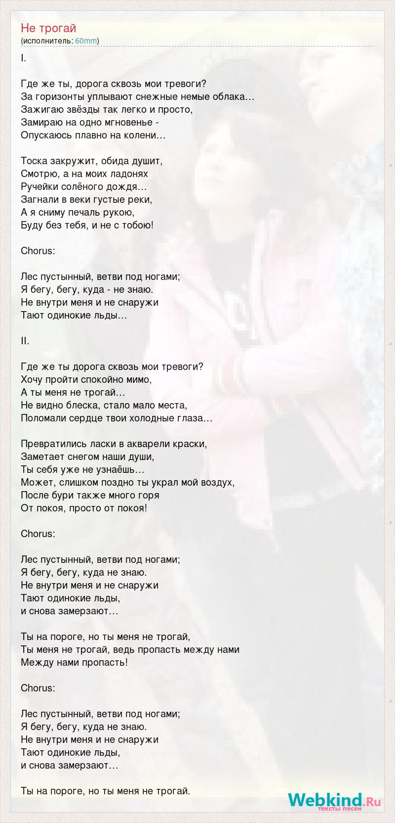 I. Где же ты, дорога сквозь мои тревоги? За горизонты уплывают снежные немые облака… Зажигаю звёзды так легко и просто, Замираю на одно мгновенье - Опускаюсь плавно на колени… Тоска закружит, обида душит, Смотрю, а на моих ладонях Ручейки солёного дождя… Загнали в веки густые реки, А я сниму печаль рукою, Буду без тебя, и не с тобою! Chorus: Лес пустынный, ветви под ногами; Я бегу, бегу, куда - не знаю. Не внутри меня и не снаружи Тают одинокие льды… II. Где же ты дорога сквозь мои тревоги? Хочу пройти спокойно мимо, А ты меня не трогай… Не видно блеска, стало мало места, Поломали сердце твои холодные глаза… Превратились ласки в акварели краски, Заметает снегом наши души, Ты себя уже не узнаёшь… Может, слишком поздно ты украл мой воздух, После бури также много горя От покоя, просто от покоя! Chorus: Лес пустынный, ветви под ногами; Я бегу, бегу, куда не знаю. Не внутри меня и не снаружи Тают одинокие льды, и снова замерзают… Ты на пороге, но ты меня не трогай, Ты меня не трогай, ведь пропасть между нами Между нами пропасть! Chorus: Лес пустынный, ветви под ногами; Я бегу, бегу, куда не знаю. Не внутри меня и не снаружи Тают одинокие льды, и снова замерзают… Ты на пороге, но ты меня не трогай.