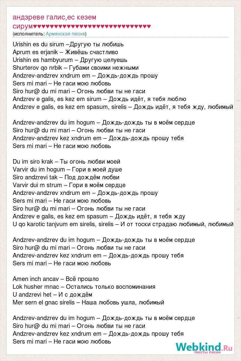 Urishin es du sirum –Другую ты любишь Aprum es erjanik – Живёшь счастливо Urishin es hambyurum – Другую целуешь Shurterov qo nrbik – Губами своими нежными Andzrev-andzrev xndrum em – Дождь-дождь прошу Sers mi mari – Не гаси мою любовь Siro hur@ du mi mari – Огонь любви ты не гаси Andzrev e galis, es kez em sirum – Дождь идёт, я тебя люблю Andzrev e galis, es kez em spasum, sirelis – Дождь идёт, я тебя жду, любимый Andzrev-andzrev du im hogum – Дождь-дождь ты в моём сердце Siro hur@ du mi mari – Огонь любви ты не гаси Andzrev-andzrev kez xndrum em – Дождь-дождь прошу тебя Sers mi mari – Не гаси мою любовь Du im siro krak – Ты огонь любви моей Varvir du im hogum – Гори в моей душе Siro andzrevi tak – Под дождём любви Varvir dui m strum – Гори в моём сердце Andzrev-andzrev xndrum em – Дождь-дождь прошу Sers mi mari – Не гаси мою любовь Siro hur@ du mi mari – Огонь любви ты не гаси Andzrev e galis, es kez em spasum – Дождь идёт, я тебя жду U qo karotic tanjvum em sirelis, sirelis – И от тоски страдаю любимый, любимый Andzrev-andzrev du im hogum – Дождь-дождь ты в моём сердце Siro hur@ du mi mari – Огонь любви ты не гаси Andzrev-andzrev kez xndrum em – Дождь-дождь прошу тебя Sers mi mari – Не гаси мою любовь Amen inch ancav – Всё прошло Lok husher mnac – Остались только воспоминания U andzrevi het – И с дождём Mer sern el gnac sirelis – Наша любовь ушла, любимый Andzrev-andzrev du im hogum – Дождь-дождь ты в моём сердце Siro hur@ du mi mari – Огонь любви ты не гаси Andzrev-andzrev kez xndrum em – Дождь-дождь прошу тебя Sers mi mari – Не гаси мою любовь