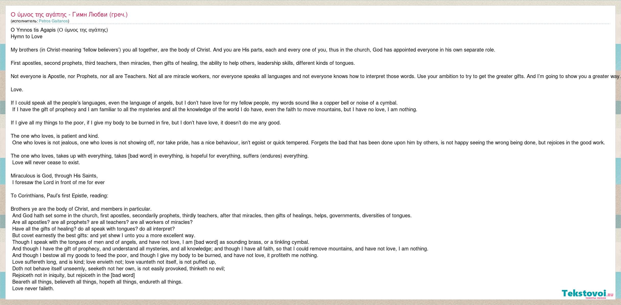 O Ymnos tis Agapis (Ο ύμνος της αγάπης) Hymn to Love My brothers (in Christ-meaning ‘fellow believers’) you all together, are the body of Christ. And you are His parts, each and every one of you, thus in the church, God has appointed everyone in his own separate role. First apostles, second prophets, third teachers, then miracles, then gifts of healing, the ability to help others, leadership skills, different kinds of tongues. Not everyone is Apostle, nor Prophets, nor all are Teachers. Not all are miracle workers, nor everyone speaks all languages and not everyone knows how to interpret those words. Use your ambition to try to get the greater gifts. And I’m going to show you a greater way. Love. If I could speak all the people’s languages, even the language of angels, but I don’t have love for my fellow people, my words sound like a copper bell or noise of a cymbal. If I have the gift of prophecy and I am familiar to all the mysteries and all the knowledge of the world I do have, even the faith to move mountains, but I have no love, I am nothing. If I give all my things to the poor, if I give my body to be burned in fire, but I don’t have love, it doesn’t do me any good. The one who loves, is patient and kind. One who loves is not jealous, one who loves is not showing off, nor take pride, has a nice behaviour, isn’t egoist or quick tempered. Forgets the bad that has been done upon him by others, is not happy seeing the wrong being done, but rejoices in the good work. The one who loves, takes up with everything, takes trust in everything, is hopeful for everything, suffers (endures) everything. Love will never cease to exist. Miraculous is God, through His Saints, I foresaw the Lord in front of me for ever To Corinthians, Paul’s first Epistle, reading: Brothers ye are the body of Christ, and members in particular. And God hath set some in the church, first apostles, secondarily prophets, thirdly teachers, after that miracles, then gifts of healings, helps, governments, diversities of tongues. Are all apostles? are all prophets? are all teachers? are all workers of miracles? Have all the gifts of healing? do all speak with tongues? do all interpret? But covet earnestly the best gifts: and yet shew I unto you a more excellent way. Though I speak with the tongues of men and of angels, and have not love, I am become as sounding brass, or a tinkling cymbal. And though I have the gift of prophecy, and understand all mysteries, and all knowledge; and though I have all faith, so that I could remove mountains, and have not love, I am nothing. And though I bestow all my goods to feed the poor, and though I give my body to be burned, and have not love, it profiteth me nothing. Love suffereth long, and is kind; love envieth not; love vaunteth not itself, is not puffed up, Doth not behave itself unseemly, seeketh not her own, is not easily provoked, thinketh no evil; Rejoiceth not in iniquity, but rejoiceth in the truth; Beareth all things, believeth all things, hopeth all things, endureth all things. Love never faileth.