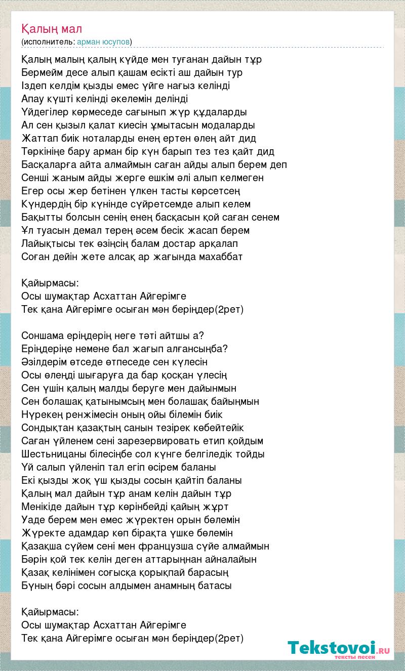 Қалың малың қалың күйде мен туғанан дайын тұр Бермейм десе алып қашам есікті аш дайын тур Іздеп келдім қызды емес үйге нағыз келінді Апау күшті келінді әкелемін делінді Үйдегілер көрмеседе сағынып жүр құдаларды Ал сен қызыл қалат киесін ұмытасын модаларды Жаттап биік ноталарды енең ертен өлең айт дид Төркініңе бару арман бір күн барып тез тез қайт дид Басқаларға айта алмаймын саған айды алып берем деп Сенші жаным айды жерге ешкім әлі алып келмеген Егер осы жер бетінен үлкен тасты көрсетсең Күндердің бір күнінде сүйретсемде алып келем Бақытты болсын сенің енең басқасын қой саған сенем Ұл туасын демал терең әсем бесік жасап берем Лайықтысы тек өзіңсің балам достар арқалап Соған дейін жете алсақ ар жағында махаббат Қайырмасы: Осы шумақтар Асхаттан Айгерімге Тек қана Айгерімге осыған мән беріңдер(2рет) Соншама еріңдерің неге тәті айтшы а? Еріңдеріңе немене бал жағып алғансыңба? Әзілдерім өтседе өтпеседе сен күлесін Осы өлеңді шығаруға да бар қосқан үлесің Сен үшін қалың малды беруге мен дайынмын Сен болашақ қатынымсың мен болашақ байыңмын Нүрекең ренжімесін оның ойы білемін биік Сондықтан қазақтың санын тезірек көбейтейік Саған үйленем сені зарезервировать етип қойдым Шестьницаны білесіңбе сол күнге белгіледік тойды Үй салып үйленіп тал егіп өсірем баланы Екі қызды жоқ үш қызды сосын қайтіп баланы Қалың мал дайын тұр анам келін дайын тұр Менікіде дайын тұр көрінбейді қайың жұрт Уаде берем мен емес жүректен орын бөлемін Жүректе адамдар көп бірақта үшке бөлемін Қазақша сүйем сені мен французша сүйе алмаймын Бәрін қой тек келін деген аттарыңнан айналайын Қазақ келінімен соғысқа қорықпай барасың Бүның бәрі сосын алдымен анамның батасы Қайырмасы: Осы шумақтар Асхаттан Айгерімге Тек қана Айгерімге осыған мән беріңдер(2рет)