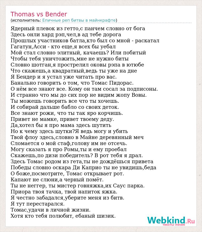 Ядерный плевок из гетто,с панчем словно от бога Здесь онли хард рэп,чел,в ад тебе дорога Прошлых участников батла,кто был со мной - раскатал Гагатун,Асси - кто еще,я всех бы уебал Мой стал словно элитный, качаешь? Или побитый Чтобы тебя уничтожить,мне не нужно биты Словно шотган,я прострелил оковы рэпа в ютюбе Что скажешь,а квадратный,ведь ты уже на дне Я Бендер и я устал уже читать про вас. Банально говорить о том, что Томас Пидорас. О нём все знают все. Кому он там сосал за подписоны. И странно что мы до сих пор не видим жопу Вовы. Ты можешь говорить все что ты хочешь. И собирай дальше бабло со своих деток. Все знают рожи, что ты так яро корчишь. Привет не мамке, привет твоему деду. Да,хотел бы я про мама здесь шутить Но к чему здесь шутки?Я ведь могу и убить Твой флоу здесь,словно в Майне деревянный меч Сломается о мой стаф,голову им не отсечь. Могу сказать я про Ромы,ты и ему проебал Скажешь,по дизи победитель? В рот тебя я драл. Здесь Томас родом из гета,ты не дождёшься привета Победы словно оскара Ди Каприо ты не увидишь,беда О боже,посмотрите, Томас открывает рот. Капают не слюни,а черный помёт. Ты не неггер, ты мистер говняжка,их Саус парка. Приора твоя тачка, твой напиток яжка. Я честно забадался,уберите меня из битв. Я тут перестарался. Томас,удачи в личной жизни. Хотя кто тебя полюбит, ебаный шизик.