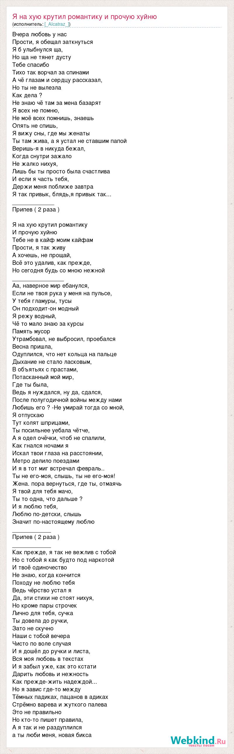 Вчера любовь у нас Прости, я обещал заткнуться Я б улыбнулся ща, Но ща не тянет дусту Тебе спасибо Тихо так ворчал за спинами А чё глазам и сердцу рассказал, Но ты не вылезла Как дела ? Не знаю чё там за мена базарят Я всех не помню, Не моё всех помнишь, знаешь Опять не спишь, Я вижу сны, где мы женаты Ты там жива, а я устал не ставшим папой Веришь-я в никуда бежал, Когда снутри зажало Не жалко нихуя, Лишь бы ты просто была счастлива И если я часть тебя, Держи меня поближе завтра Я так привык, блядь,я привык так... _____________ Припев ( 2 раза ) Я на хую крутил романтику И прочую хуйню Тебе не в кайф моим кайфам Прости, я так живу А хочешь, не прощай, Всё это удалив, как прежде, Но сегодня будь со мною нежной ________________ Аа, наверное мир ебанулся, Если не твоя рука у меня на пульсе, У тебя гламуры, тусы Он подходит-он модный Я режу водный, Чё то мало знаю за курсы Память мусор Утрамбовал, не выбросил, проебался Весна пришла, Одуплился, что нет кольца на пальце Дыхание не стало ласковым, В объятьях с прастами, Потасканный мой мир, Где ты была, Ведь я нуждался, ну да, сдался, После полугодичной войны между нами Любишь его ? -Не умирай тогда со мной, Я отпускаю Тут колят шприцами, Ты посильнее уебала чётче, А я одел очёчки, чтоб не спалили, Как гнался ночами я Искал твои глаза на расстоянии, Метро делило поездами И я в тот миг встречал февраль.. Ты не его-моя, слышь, ты не его-моя! Жена. пора вернуться, где ты, отмаячь Я твой для тебя мачо, Ты то одна, что дальше ? И я люблю тебя, Люблю по-детски, слышь Значит по-настоящему люблю ____________ Припев ( 2 раза ) ____________ Как прежде, я так не вежлив с тобой Но с тобой я как будто под наркотой И твоё одиночество Не знаю, когда кончится Походу не люблю тебя Ведь чёрство устал я Да, эти стихи не стоят нихуя, Но кроме пары строчек Лично для тебя, сучка Ты довела до ручки, Зато не скучно Наши с тобой вечера Чисто по воле случая И я дошёл до ручки и листа, Вся моя любовь в текстах И я забыл уже, как это кстати Дарить любовь и нежность Как прежде-жить надеждой... Но я завис где-то между Тёмных падиках, пацанов в адиках Стрёмно варева и жуткого палева Это не правильно Но кто-то пишет правила, А я так и не раздуплился а ты люби меня, новая бикса