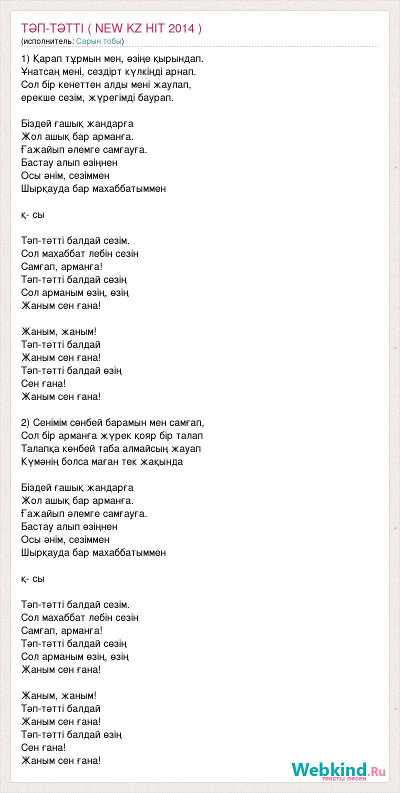 1) Қарап тұрмын мен, өзіңе қырындап. Ұнатсаң мені, сездірт күлкіңді арнап. Сол бір кенеттен алды мені жаулап, ерекше сезім, жүрегімді баурап. Біздей ғашық жандарға Жол ашық бар арманға. Ғажайып әлемге самғауға. Бастау алып өзіңнен Осы әнім, сезіммен Шырқауда бар махаббатыммен қ- сы Тәп-тәтті балдай сезім. Сол махаббат лебін сезін Самғап, арманға! Тәп-тәтті балдай сөзің Сол арманым өзің, өзің Жаным сен ғана! Жаным, жаным! Тәп-тәтті балдай Жаным сен ғана! Тәп-тәтті балдай өзің Сен ғана! Жаным сен ғана! 2) Сенімім сөнбей барамын мен самғап, Сол бір арманға жүрек қояр бір талап Талапқа көнбей таба алмайсың жауап Күмәнің болса маған тек жақында Біздей ғашық жандарға Жол ашық бар арманға. Ғажайып әлемге самғауға. Бастау алып өзіңнен Осы әнім, сезіммен Шырқауда бар махаббатыммен қ- сы Тәп-тәтті балдай сезім. Сол махаббат лебін сезін Самғап, арманға! Тәп-тәтті балдай сөзің Сол арманым өзің, өзің Жаным сен ғана! Жаным, жаным! Тәп-тәтті балдай Жаным сен ғана! Тәп-тәтті балдай өзің Сен ғана! Жаным сен ғана!