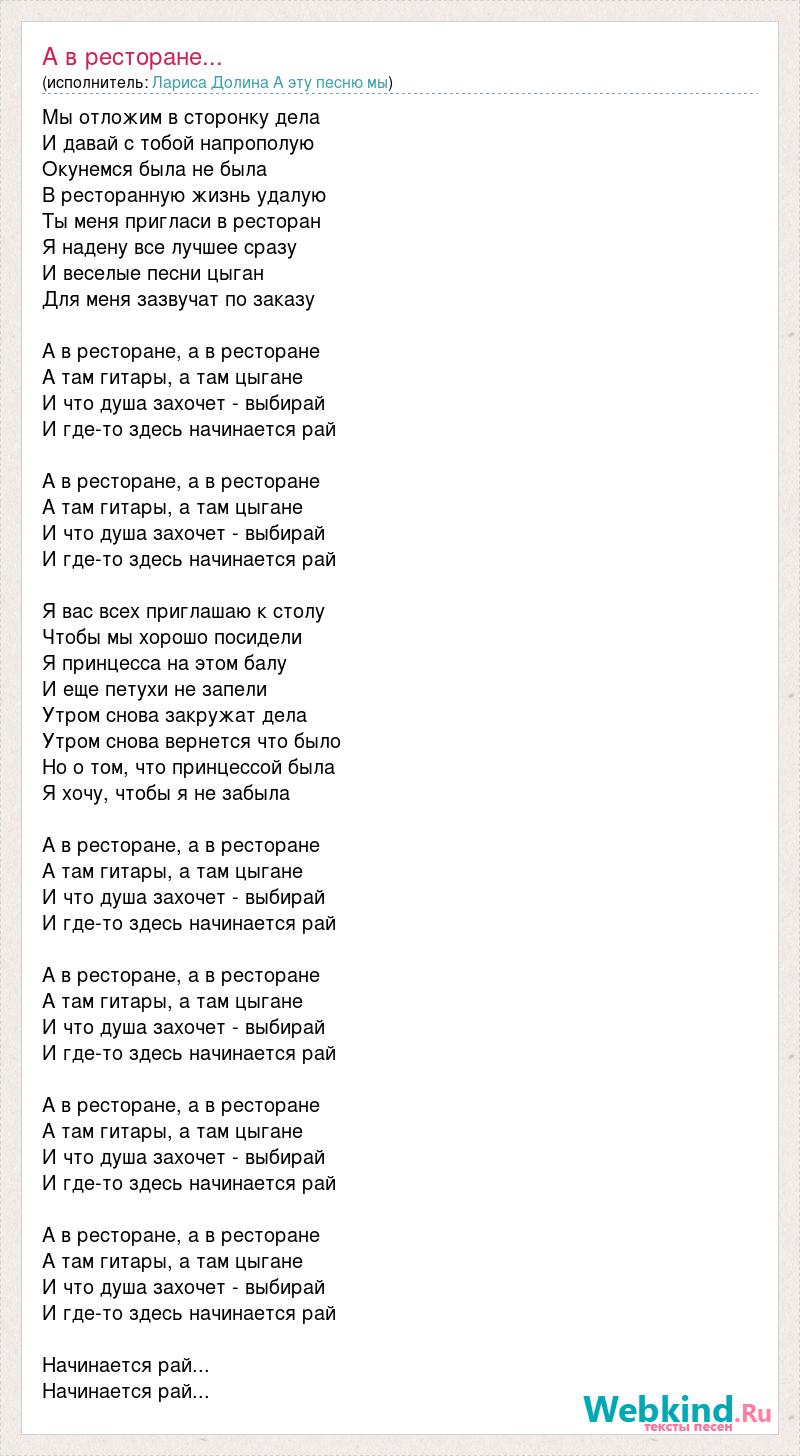 Мы отложим в сторонку дела И давай с тобой напрополую Окунемся была не была В ресторанную жизнь удалую Ты меня пригласи в ресторан Я надену все лучшее сразу И веселые песни цыган Для меня зазвучат по заказу А в ресторане, а в ресторане А там гитары, а там цыгане И что душа захочет - выбирай И где-то здесь начинается рай А в ресторане, а в ресторане А там гитары, а там цыгане И что душа захочет - выбирай И где-то здесь начинается рай Я вас всех приглашаю к столу Чтобы мы хорошо посидели Я принцесса на этом балу И еще петухи не запели Утром снова закружат дела Утром снова вернется что было Но о том, что принцессой была Я хочу, чтобы я не забыла А в ресторане, а в ресторане А там гитары, а там цыгане И что душа захочет - выбирай И где-то здесь начинается рай А в ресторане, а в ресторане А там гитары, а там цыгане И что душа захочет - выбирай И где-то здесь начинается рай А в ресторане, а в ресторане А там гитары, а там цыгане И что душа захочет - выбирай И где-то здесь начинается рай А в ресторане, а в ресторане А там гитары, а там цыгане И что душа захочет - выбирай И где-то здесь начинается рай Начинается рай... Начинается рай...