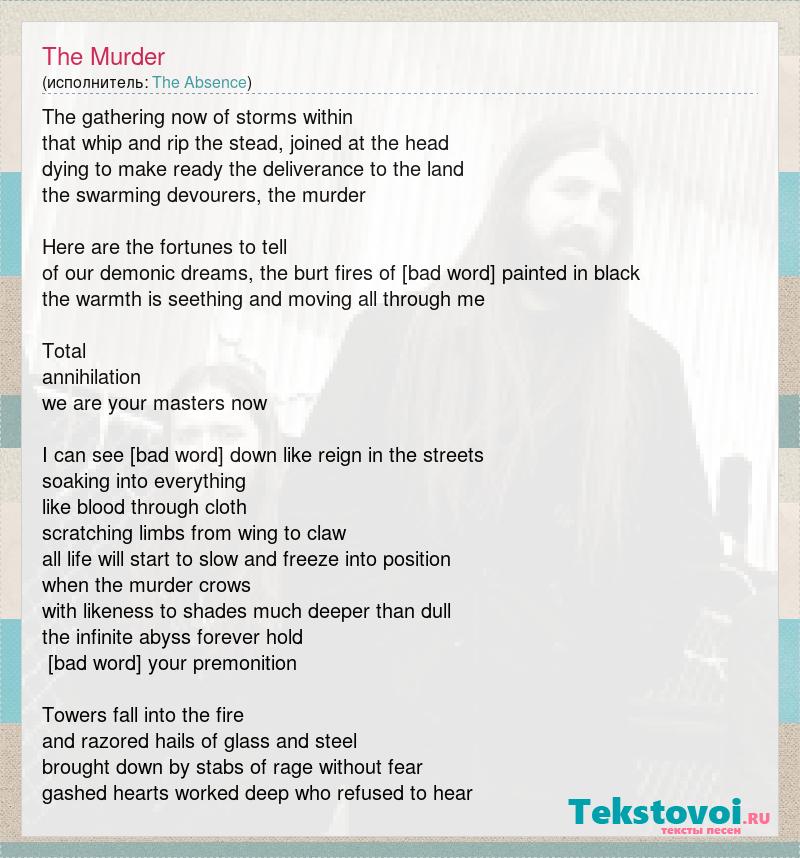 The gathering now of storms within that whip and rip the stead, joined at the head dying to make ready the deliverance to the land the swarming devourers, the murder Here are the fortunes to tell of our demonic dreams, the burt fires of hell painted in black the warmth is seething and moving all through me Total annihilation we are your masters now I can see them coming down like reign in the streets soaking into everything like blood through cloth scratching limbs from wing to claw all life will start to slow and freeze into position when the murder crows with likeness to shades much deeper than dull the infinite abyss forever hold Crushing your premonition Towers fall into the fire and razored hails of glass and steel brought down by stabs of rage without fear gashed hearts worked deep who refused to hear