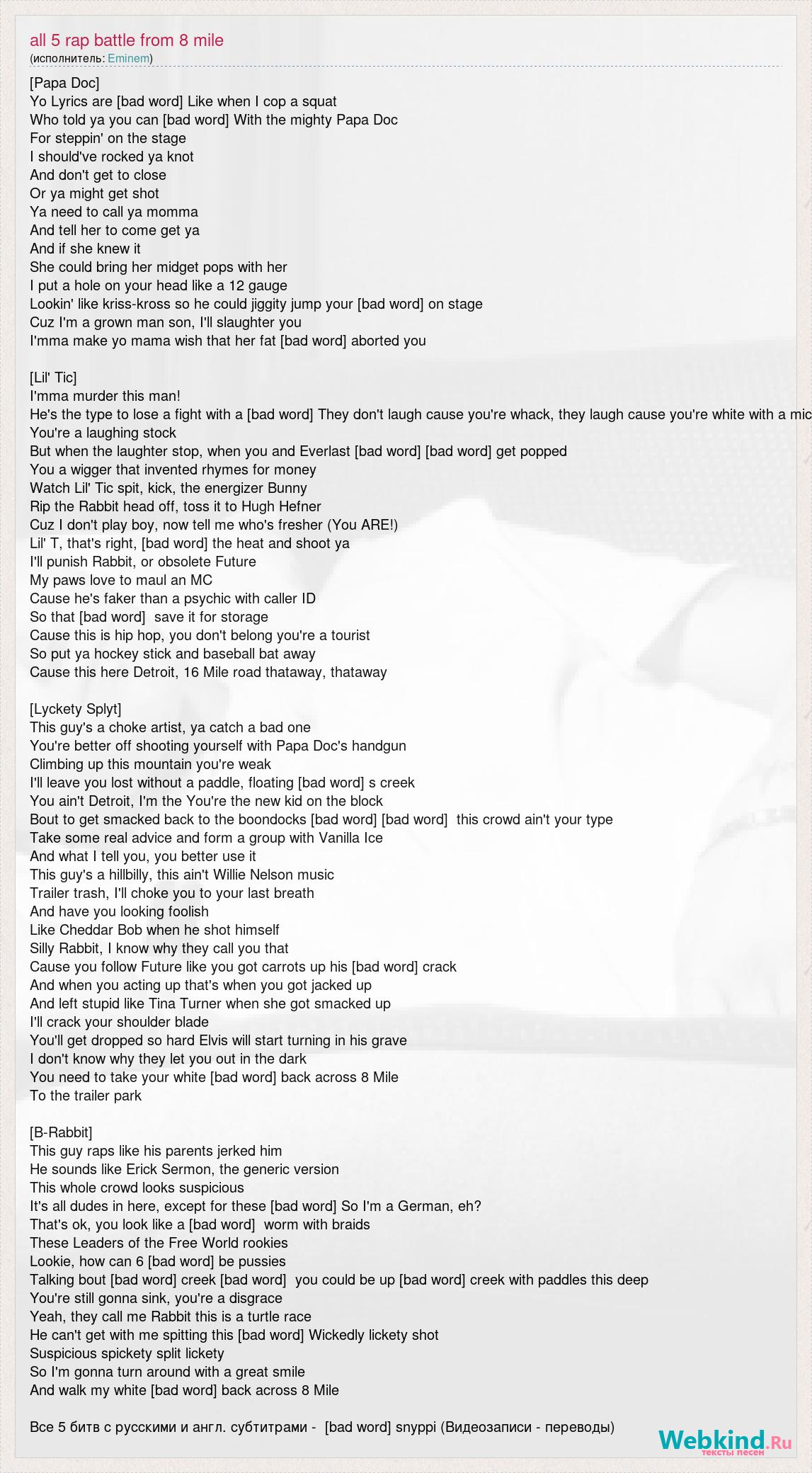 [Papa Doc] Yo Lyrics are [bad word] Like when I cop a squat Who told ya you can [bad word] With the mighty Papa Doc For steppin' on the stage I should've rocked ya knot And don't get to close Or ya might get shot Ya need to call ya momma And tell her to come get ya And if she knew it She could bring her midget pops with her I put a hole on your head like a 12 gauge Lookin' like kriss-kross so he could jiggity jump your [bad word] on stage Cuz I'm a grown man son, I'll slaughter you I'mma make yo mama wish that her fat [bad word] aborted you [Lil' Tic] I'mma murder this man! He's the type to lose a fight with a [bad word] They don't laugh cause you're whack, they laugh cause you're white with a mic You're a laughing stock But when the laughter stop, when you and Everlast [bad word] [bad word] get popped You a wigger that invented rhymes for money Watch Lil' Tic spit, kick, the energizer Bunny Rip the Rabbit head off, toss it to Hugh Hefner Cuz I don't play boy, now tell me who's fresher (You ARE!) Lil' T, that's right, [bad word] the heat and shoot ya I'll punish Rabbit, or obsolete Future My paws love to maul an MC Cause he's faker than a psychic with caller ID So that [bad word] save it for storage Cause this is hip hop, you don't belong you're a tourist So put ya hockey stick and baseball bat away Cause this here Detroit, 16 Mile road thataway, thataway [Lyckety Splyt] This guy's a choke artist, ya catch a bad one You're better off shooting yourself with Papa Doc's handgun Climbing up this mountain you're weak I'll leave you lost without a paddle, floating [bad word] s creek You ain't Detroit, I'm the You're the new kid on the block Bout to get smacked back to the boondocks [bad word] [bad word] this crowd ain't your type Take some real advice and form a group with Vanilla Ice And what I tell you, you better use it This guy's a hillbilly, this ain't Willie Nelson music Trailer trash, I'll choke you to your last breath And have you looking foolish Like Cheddar Bob when he shot himself Silly Rabbit, I know why they call you that Cause you follow Future like you got carrots up his [bad word] crack And when you acting up that's when you got jacked up And left stupid like Tina Turner when she got smacked up I'll crack your shoulder blade You'll get dropped so hard Elvis will start turning in his grave I don't know why they let you out in the dark You need to take your white [bad word] back across 8 Mile To the trailer park [B-Rabbit] This guy raps like his parents jerked him He sounds like Erick Sermon, the generic version This whole crowd looks suspicious It's all dudes in here, except for these [bad word] So I'm a German, eh? That's ok, you look like a [bad word] worm with braids These Leaders of the Free World rookies Lookie, how can 6 [bad word] be pussies Talking bout [bad word] creek [bad word] you could be up [bad word] creek with paddles this deep You're still gonna sink, you're a disgrace Yeah, they call me Rabbit this is a turtle race He can't get with me spitting this [bad word] Wickedly lickety shot Suspicious spickety split lickety So I'm gonna turn around with a great smile And walk my white [bad word] back across 8 Mile Все 5 битв с русскими и англ. субтитрами - [bad word] snyppi (Видеозаписи - переводы)
