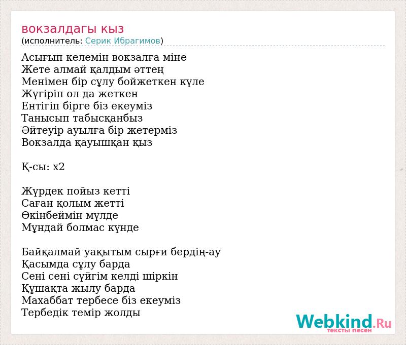 Асығып келемін вокзалға міне Жете алмай қалдым әттең Менімен бір сұлу бойжеткен күле Жүгіріп ол да жеткен Ентігіп бірге біз екеуміз Танысып табысқанбыз Әйтеуір ауылға бір жетерміз Вокзалда қауышқан қыз Қ-сы: х2 Жүрдек пойыз кетті Саған қолым жетті Өкінбеймін мүлде Мұндай болмас күнде Байқалмай уақытым сырғи бердің-ау Қасымда сұлу барда Сені сені сүйгім келді шіркін Құшақта жылу барда Махаббат тербесе біз екеуміз Тербедік темір жолды