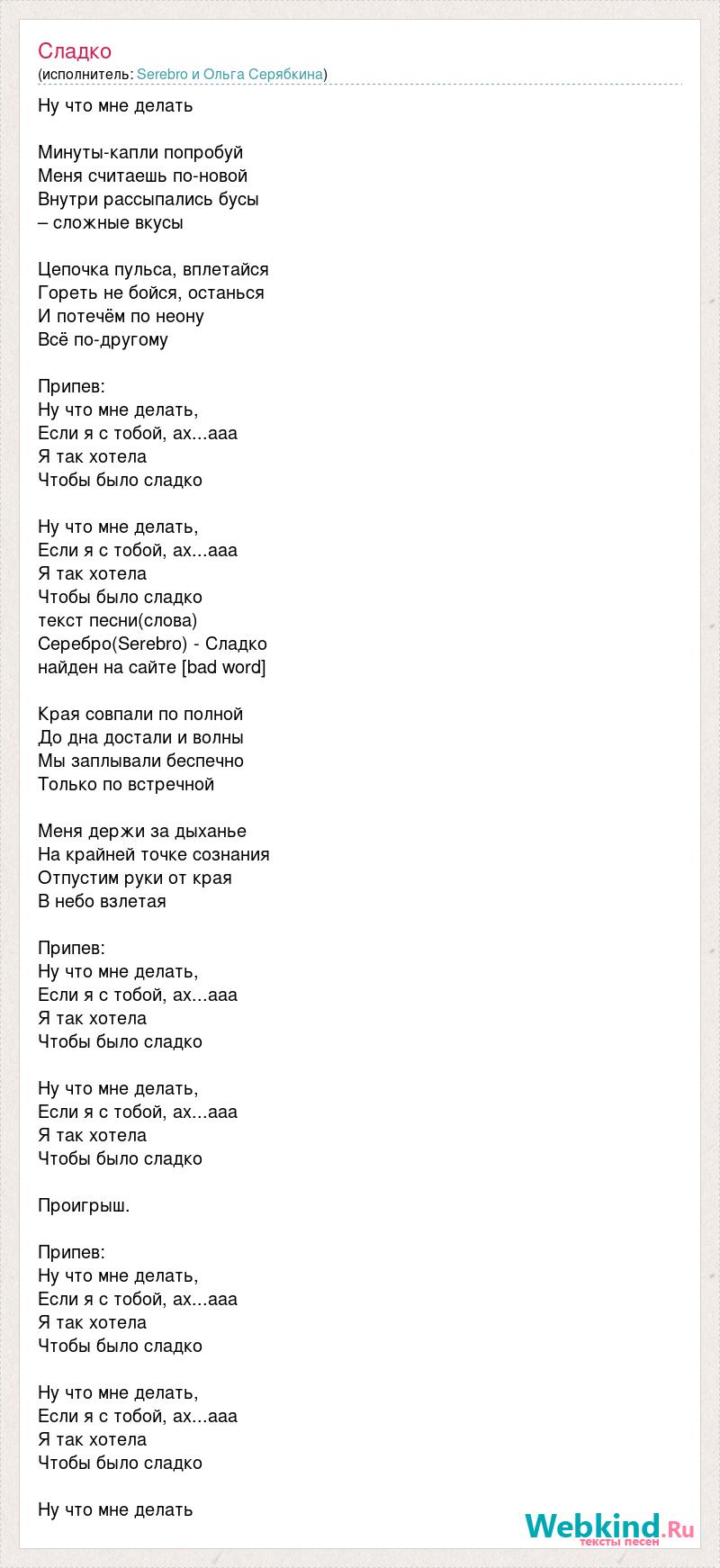 Ну что мне делать Минуты-капли попробуй Меня считаешь по-новой Внутри рассыпались бусы – сложные вкусы Цепочка пульса, вплетайся Гореть не бойся, останься И потечём по неону Всё по-другому Припев: Ну что мне делать, Если я с тобой, ах...ааа Я так хотела Чтобы было сладко Ну что мне делать, Если я с тобой, ах...ааа Я так хотела Чтобы было сладко текст песни(слова) Серебро(Serebro) - Сладко найден на сайте [bad word] Края совпали по полной До дна достали и волны Мы заплывали беспечно Только по встречной Меня держи за дыханье На крайней точке сознания Отпустим руки от края В небо взлетая Припев: Ну что мне делать, Если я с тобой, ах...ааа Я так хотела Чтобы было сладко Ну что мне делать, Если я с тобой, ах...ааа Я так хотела Чтобы было сладко Проигрыш. Припев: Ну что мне делать, Если я с тобой, ах...ааа Я так хотела Чтобы было сладко Ну что мне делать, Если я с тобой, ах...ааа Я так хотела Чтобы было сладко Ну что мне делать