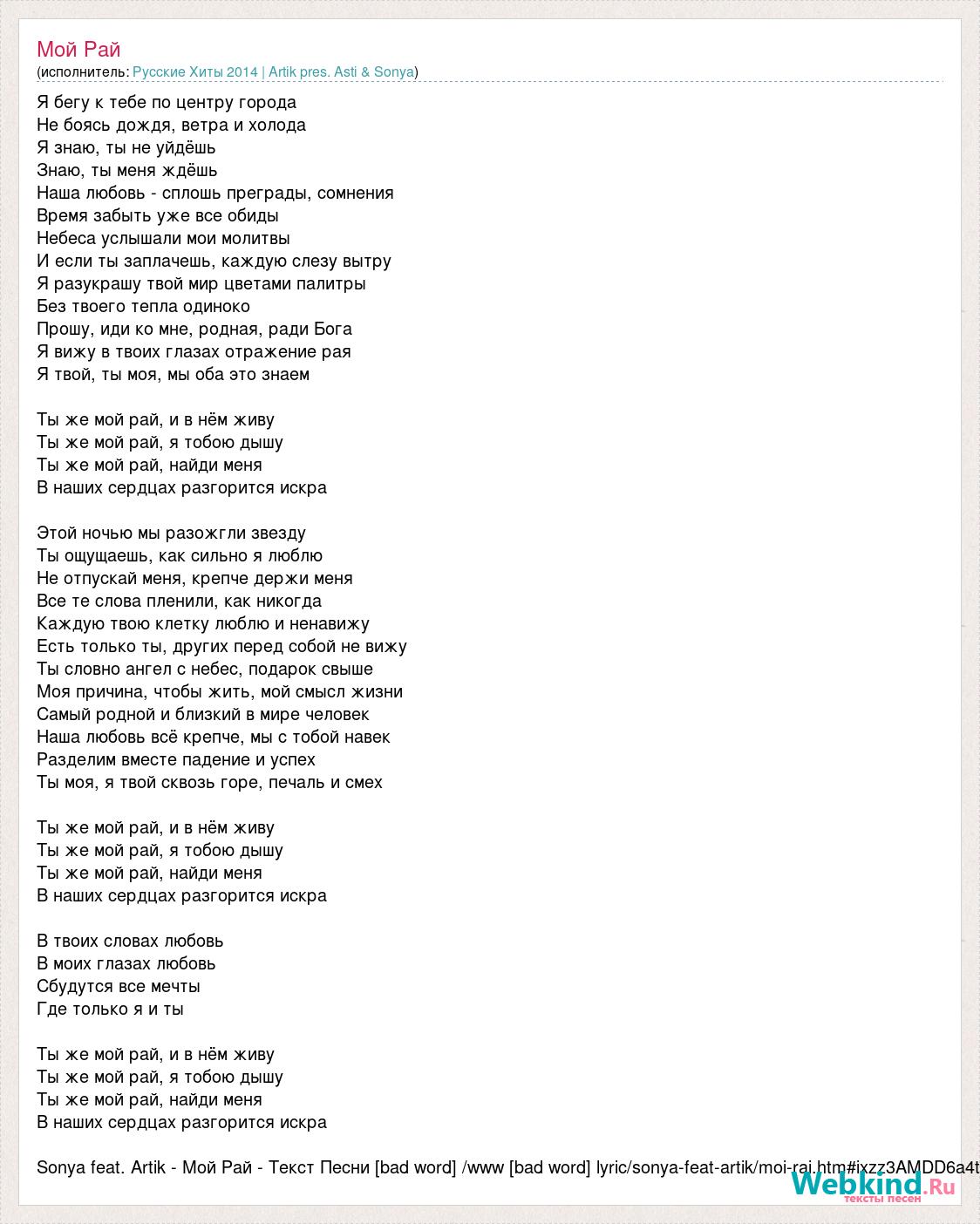 Я бегу к тебе по центру города Не боясь дождя, ветра и холода Я знаю, ты не уйдёшь Знаю, ты меня ждёшь Наша любовь - сплошь преграды, сомнения Время забыть уже все обиды Небеса услышали мои молитвы И если ты заплачешь, каждую слезу вытру Я разукрашу твой мир цветами палитры Без твоего тепла одиноко Прошу, иди ко мне, родная, ради Бога Я вижу в твоих глазах отражение рая Я твой, ты моя, мы оба это знаем Ты же мой рай, и в нём живу Ты же мой рай, я тобою дышу Ты же мой рай, найди меня В наших сердцах разгорится искра Этой ночью мы разожгли звезду Ты ощущаешь, как сильно я люблю Не отпускай меня, крепче держи меня Все те слова пленили, как никогда Каждую твою клетку люблю и ненавижу Есть только ты, других перед собой не вижу Ты словно ангел с небес, подарок свыше Моя причина, чтобы жить, мой смысл жизни Самый родной и близкий в мире человек Наша любовь всё крепче, мы с тобой навек Разделим вместе падение и успех Ты моя, я твой сквозь горе, печаль и смех Ты же мой рай, и в нём живу Ты же мой рай, я тобою дышу Ты же мой рай, найди меня В наших сердцах разгорится искра В твоих словах любовь В моих глазах любовь Сбудутся все мечты Где только я и ты Ты же мой рай, и в нём живу Ты же мой рай, я тобою дышу Ты же мой рай, найди меня В наших сердцах разгорится искра Sonya feat. Artik - Мой Рай - Текст Песни [bad word] /www [bad word] lyric/sonya-feat-artik/moi-rai.htm#ixzz3AMDD6a4t