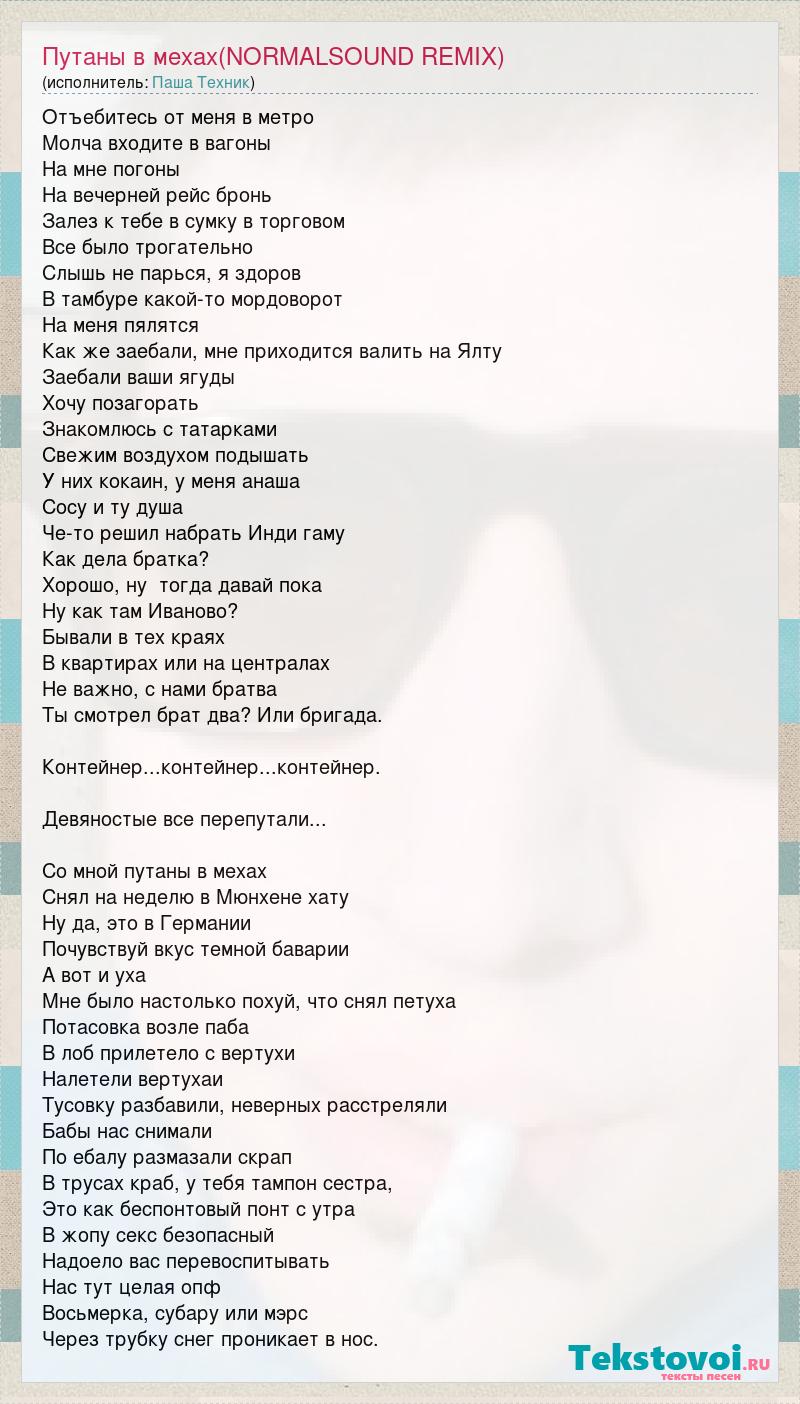 Отъебитесь от меня в метро Молча входите в вагоны На мне погоны На вечерней рейс бронь Залез к тебе в сумку в торговом Все было трогательно Слышь не парься, я здоров В тамбуре какой-то мордоворот На меня пялятся Как же заебали, мне приходится валить на Ялту Заебали ваши ягуды Хочу позагорать Знакомлюсь с татарками Свежим воздухом подышать У них кокаин, у меня анаша Сосу и ту душа Че-то решил набрать Инди гаму Как дела братка? Хорошо, ну тогда давай пока Ну как там Иваново? Бывали в тех краях В квартирах или на централах Не важно, с нами братва Ты смотрел брат два? Или бригада. Контейнер...контейнер...контейнер. Девяностые все перепутали... Со мной путаны в мехах Снял на неделю в Мюнхене хату Ну да, это в Германии Почувствуй вкус темной баварии А вот и уха Мне было настолько похуй, что снял петуха Потасовка возле паба В лоб прилетело с вертухи Налетели вертухаи Тусовку разбавили, неверных расстреляли Бабы нас снимали По ебалу размазали скрап В трусах краб, у тебя тампон сестра, Это как беспонтовый понт с утра В жопу секс безопасный Надоело вас перевоспитывать Нас тут целая опф Восьмерка, субару или мэрс Через трубку снег проникает в нос.