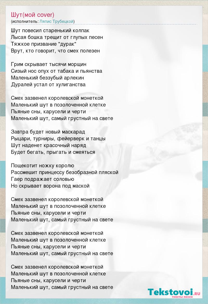 Шут повесил старенький колпак Лысая бошка трещит от глупых песен Тяжкое призвание "дурак" Врут, кто говорит, что смех полезен Грим скрывает тысячи морщин Сизый нос опух от табака и пьянства Маленький беззубый арлекин Дуралей устал от хулиганства Смех зазвенел королевской монеткой Маленький шут в позолоченной клетке Пьяные сны, карусели и черти Маленький шут, самый грустный на свете Завтра будет новый маскарад Рыцари, турниры, фейерверк и танцы Шут наденет красочный наряд Будет бегать, прыгать и смеяться Пощекотит ножку королю Рассмешит принцессу безобразной пляской Гаер подражает соловью Но скрывает ворона под маской Смех зазвенел королевской монеткой Маленький шут в позолоченной клетке Пьяные сны, карусели и черти Маленький шут, самый грустный на свете Смех зазвенел королевской монеткой Маленький шут в позолоченной клетке Пьяные сны, карусели и черти Маленький шут, самый грустный на свете Смех зазвенел королевской монеткой Маленький шут в позолоченной клетке Пьяные сны, карусели и черти Маленький шут, самый грустный на свете