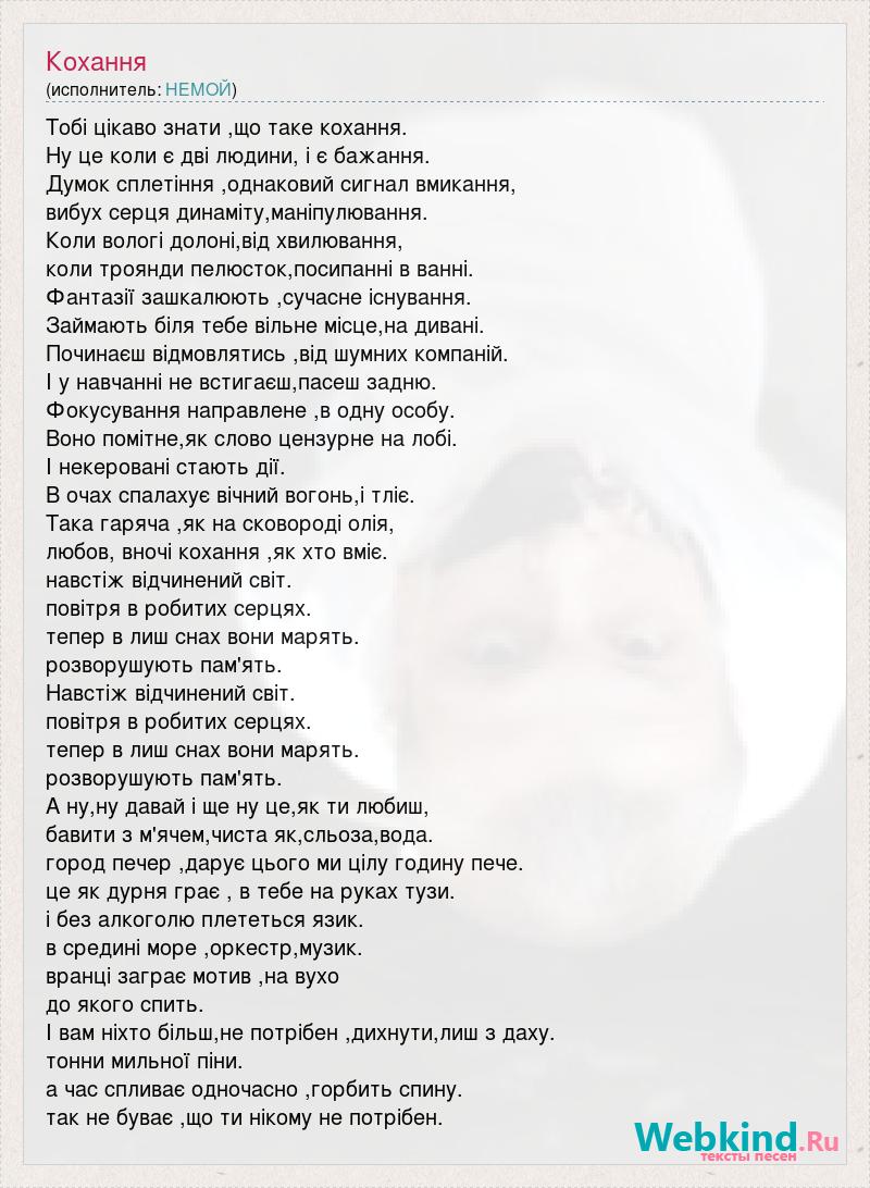 Тобі цікаво знати ,що таке кохання. Ну це коли є дві людини, і є бажання. Думок сплетіння ,однаковий сигнал вмикання, вибух серця динаміту,маніпулювання. Коли вологі долоні,від хвилювання, коли троянди пелюсток,посипанні в ванні. Фантазії зашкалюють ,сучасне існування. Займають біля тебе вільне місце,на дивані. Починаєш відмовлятись ,від шумних компаній. І у навчанні не встигаєш,пасеш задню. Фокусування направлене ,в одну особу. Воно помітне,як слово цензурне на лобі. І некеровані стають дії. В очах спалахує вічний вогонь,і тліє. Така гаряча ,як на сковороді олія, любов, вночі кохання ,як хто вміє. навстіж відчинений світ. повітря в робитих серцях. тепер в лиш снах вони марять. розворушують пам'ять. Навстіж відчинений світ. повітря в робитих серцях. тепер в лиш снах вони марять. розворушують пам'ять. А ну,ну давай і ще ну це,як ти любиш, бавити з м'ячем,чиста як,сльоза,вода. город печер ,дарує цього ми цілу годину пече. це як дурня грає , в тебе на руках тузи. і без алкоголю плететься язик. в средині море ,оркестр,музик. вранці заграє мотив ,на вухо до якого спить. І вам ніхто більш,не потрібен ,дихнути,лиш з даху. тонни мильної піни. а час спливає одночасно ,горбить спину. так не буває ,що ти нікому не потрібен.
