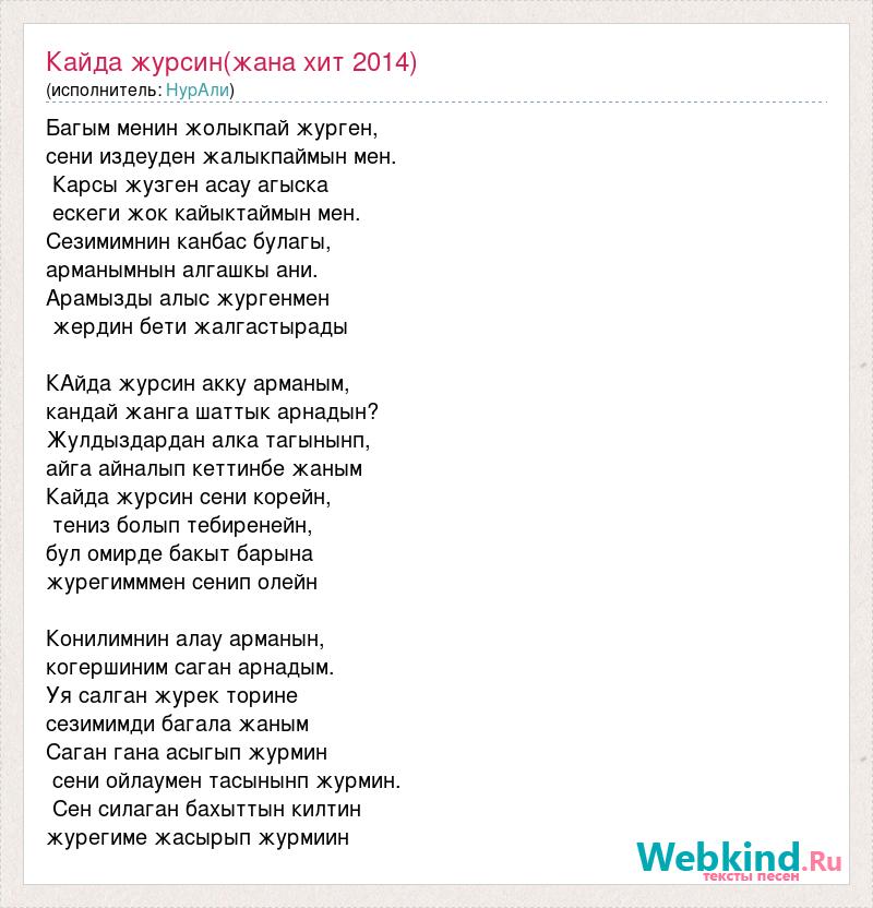 Багым менин жолыкпай журген, сени издеуден жалыкпаймын мен. Карсы жузген асау агыска ескеги жок кайыктаймын мен. Сезимимнин канбас булагы, арманымнын алгашкы ани. Арамызды алыс жургенмен жердин бети жалгастырады КАйда журсин акку арманым, кандай жанга шаттык арнадын? Жулдыздардан алка тагынынп, айга айналып кеттинбе жаным Кайда журсин сени корейн, тениз болып тебиренейн, бул омирде бакыт барына журегимммен сенип олейн Конилимнин алау арманын, когершиним саган арнадым. Уя салган журек торине сезимимди багала жаным Саган гана асыгып журмин сени ойлаумен тасынынп журмин. Сен силаган бахыттын килтин журегиме жасырып журмиин