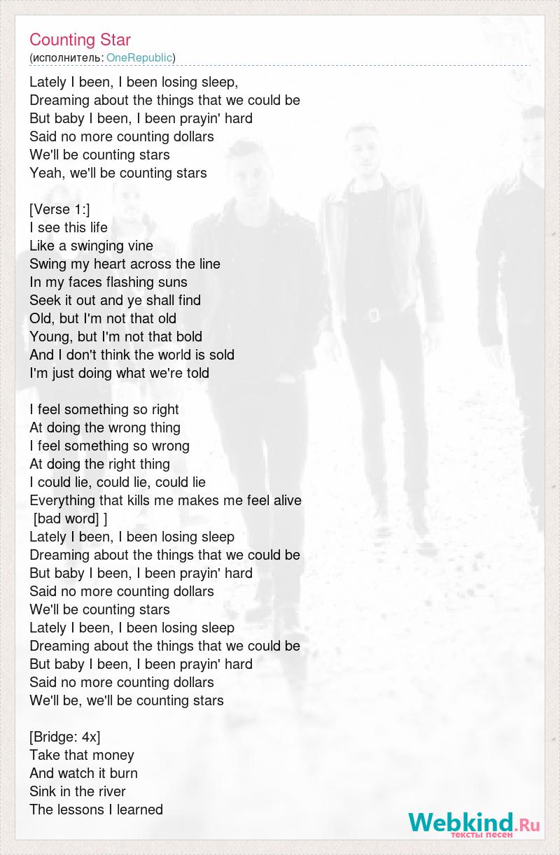 Lately I been, I been losing sleep, Dreaming about the things that we could be But baby I been, I been prayin' hard Said no more counting dollars We'll be counting stars Yeah, we'll be counting stars [Verse 1:] I see this life Like a swinging vine Swing my heart across the line In my faces flashing suns Seek it out and ye shall find Old, but I'm not that old Young, but I'm not that bold And I don't think the world is sold I'm just doing what we're told I feel something so right At doing the wrong thing I feel something so wrong At doing the right thing I could lie, could lie, could lie Everything that kills me makes me feel alive [bad word] ] Lately I been, I been losing sleep Dreaming about the things that we could be But baby I been, I been prayin' hard Said no more counting dollars We'll be counting stars Lately I been, I been losing sleep Dreaming about the things that we could be But baby I been, I been prayin' hard Said no more counting dollars We'll be, we'll be counting stars [Bridge: 4x] Take that money And watch it burn Sink in the river The lessons I learned